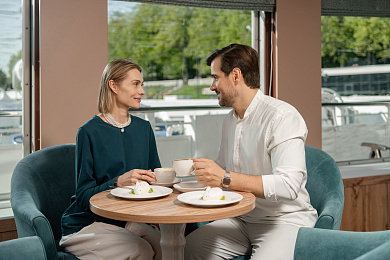 - Полупансион (завтрак + ужин): завтрак — шведский стол или заказная система с элементами шведского стола, фиксированная рассадка. Включённые напитки (без ограничения): вода*, сок, чай, кофе; ужин — заказная система питания (выбор блюд со 2-го дня круиза), фиксированная рассадка. Включённые напитки (без ограничения): вода*, чай, кофе, кисломолочный продукт (1 стакан, 200 мл); порционно на выбор - вино красное / белое / игристое (1 бокал, 125 мл) / водка (1 рюмка, 50 мл) / пиво (1 бокал, 300 мл) / домашний морс (1 бокал, 200 мл).