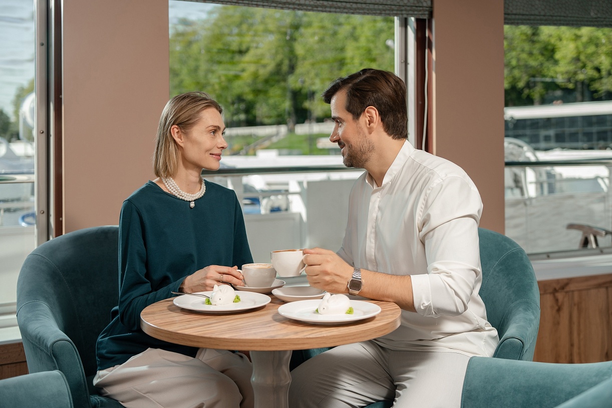 - Полный пансион (завтрак + обед + ужин): завтрак — шведский стол или заказная система с элементами шведского стола, фиксированная рассадка. Включённые напитки (без ограничения): вода*, сок, чай, кофе; обед — заказная система питания (выбор блюд со 2-го дня круиза), фиксированная рассадка. Включённые напитки (без ограничения): вода*, чай, кофе, морс (порционно); ужин — заказная система питания (выбор блюд со 2-го дня круиза), фиксированная рассадка. Включённые напитки (без ограничения): вода*, чай, кофе, кисломолочный продукт (1 стакан, 200 мл); порционно на выбор - вино красное / белое / игристое (1 бокал, 125 мл) / водка (1 рюмка, 50 мл) / пиво (1 бокал, 300 мл) / домашний морс (1 бокал, 200 мл).