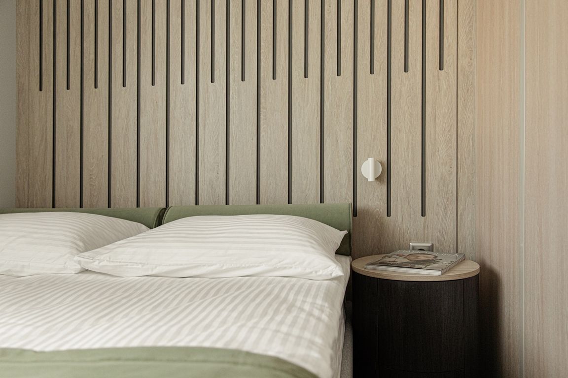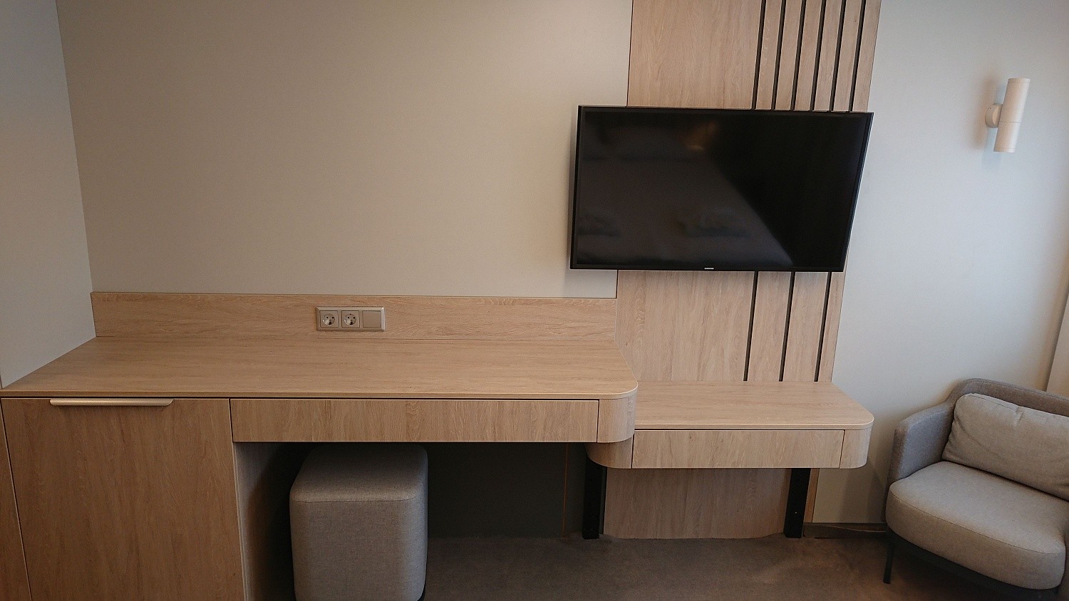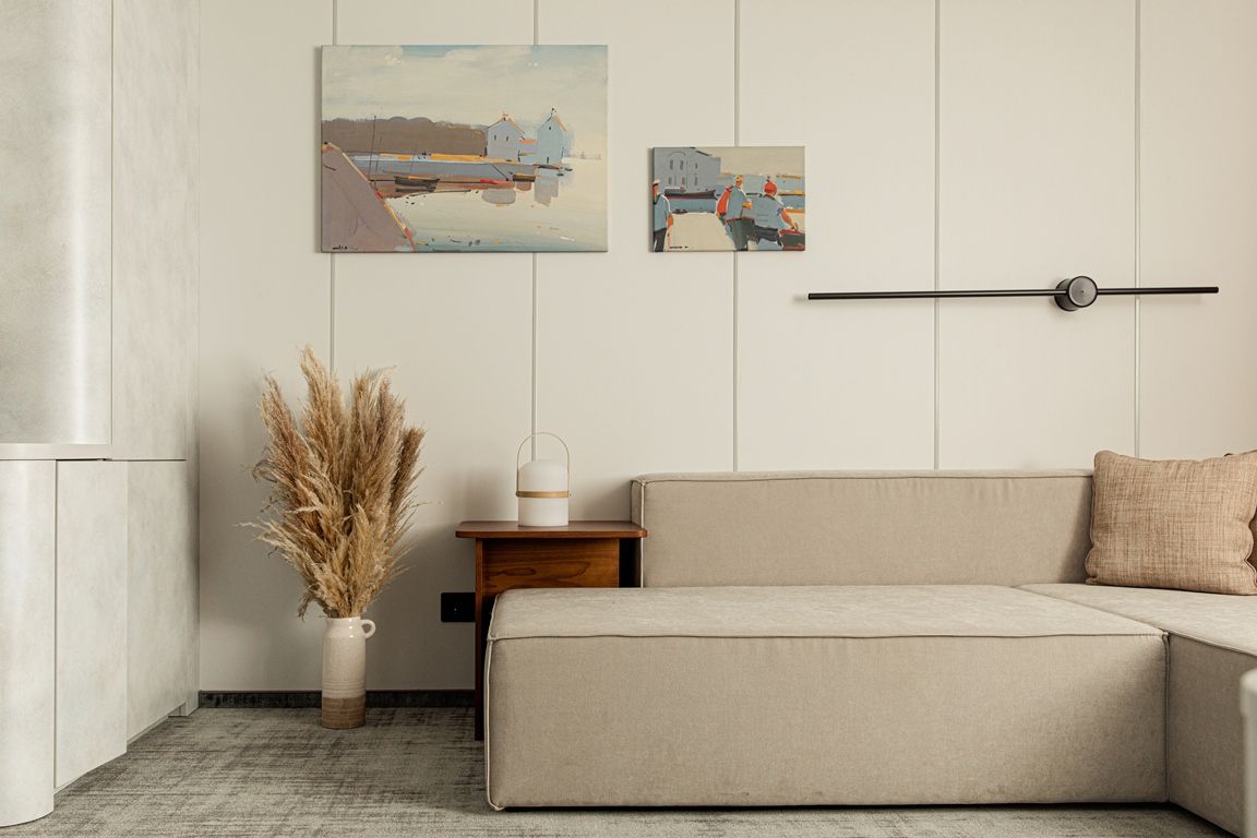 Комфортабельная гостиная с современным интерьером, шкаф для одежды, журнальный столик, диван (не раскладывается, можно разместить одного человека), пуф, трюмо, телевизор, холодильник, капсульная кофемашина, кондиционер, фен, радио, два обзорных окна, электророзетка на 220V. В спальне: двуспальная кровать, шкаф для одежды, душ, санузел, два обзорных окна.