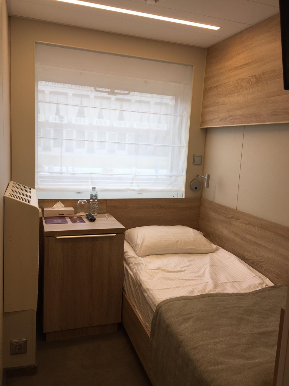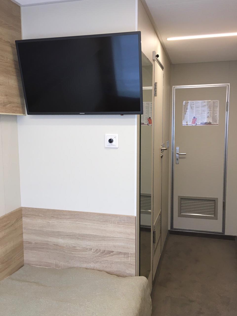 В каюте: одно спальное место, шкаф для одежды, радио, кондиционер, душ, санузел, холодильник, телевизор, фен, обзорное окно, электророзетка на 220V, площадь каюты до 7,7 м2.
