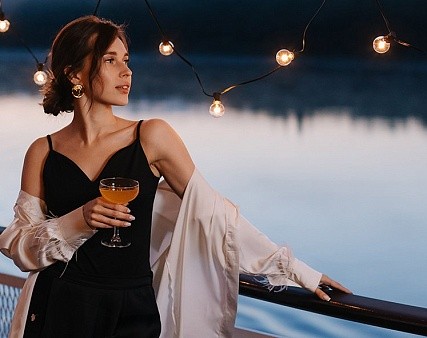 - Ужин – заказная система питания (выбор блюд со 2-го дня круиза), фиксированная рассадка. Включённые напитки (без ограничения): вода, чай, кофе. На выбор: вино красное / белое / игристое (1 бокал, 125 мл) / водка (1 рюмка, 50 мл) / пиво (1 бокал, 300 мл) / домашний морс (1 бокал, 200 мл). По запросу гостя: кисломолочный напиток (1 стакан, 200 мл).