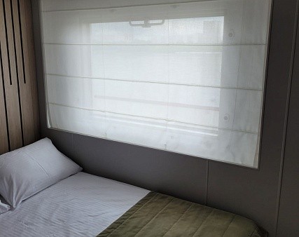 В каютах № 209-224 двуспальная кровать расположена вплотную к окну.
