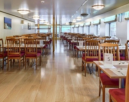- Завтрак — шведский стол или заказная система с элементами шведского стола, фиксированная рассадка. Включённые напитки (без ограничения): вода, сок, чай, кофе. В рейсах до 4-х дней при ранней высадке в день прибытия завтрак континентальный;