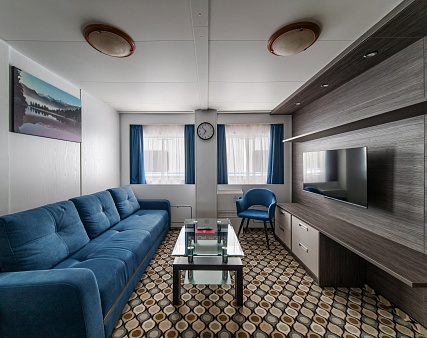 В каюте: одно спальное место, шкаф для одежды, кондиционер, радио, телевизор, холодильник, фен, сейф, обзорное окно, электророзетка на 220V, душ, санузел.