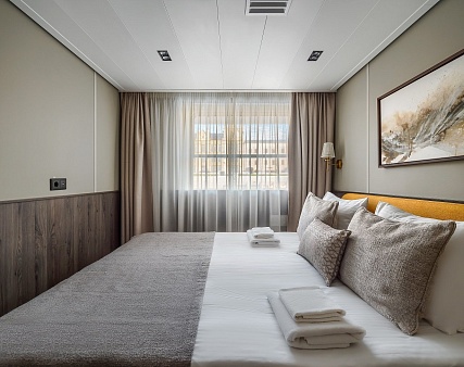 Комфортабельная комната с современным интерьером. Удобства: диван (раскладывается), телевизор, двуспальная кровать (кровати раздвигаются), прикроватные тумбы, письменный стол, холодильник, книжный стеллаж, журнальный столик, пуф, шкаф для одежды, мини-бар, 4 розетки на 220V, две розетки USB, фен. Размер кровати — 175х210 см. В каюте возможно 3-местное размещение.