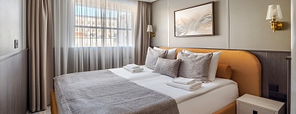 Комфортабельная комната с современным интерьером. Удобства: диван (раскладывается), телевизор, двуспальная кровать (кровати раздвигаются), прикроватные тумбы, письменный стол, холодильник, книжный стеллаж, журнальный столик, пуф, шкаф для одежды, мини-бар, 4 розетки на 220V, две розетки USB, фен. Размер кровати — 175х210 см. В каюте возможно 3-местное размещение.