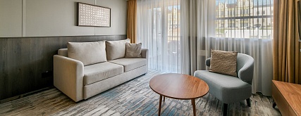 Комфортабельная гостиная с современным интерьером. Удобства: диван (раскладывается), кресло, журнальный столик, холодильник, телевизор, тумба, шкаф для одежды, прикроватные тумбы, 4 розетки на 220V, две розетки USB, фен. Балкон: два кресла, кофейный столик, два шезлонга. В спальне: двуспальная кровать (кровати раздвигаются), письменный стол, книжный стеллаж. В каюте возможно 4-местное размещение. Размер кровати —175х210 см. Размер дивана — 150х185 см.