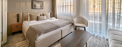 Комфортабельная комната с современным интерьером. Удобства: диван (раскладывается), телевизор, двуспальная кровать (кровати раздвигаются), прикроватные тумбы, письменный стол, холодильник, книжный стеллаж, журнальный столик, пуф, шкаф для одежды, 4 розетки на 220V, две розетки USB, фен. Балкон: два кресла, кофейный столик. Размер кровати — 175х210 см. В каюте возможно 3-местное размещение.