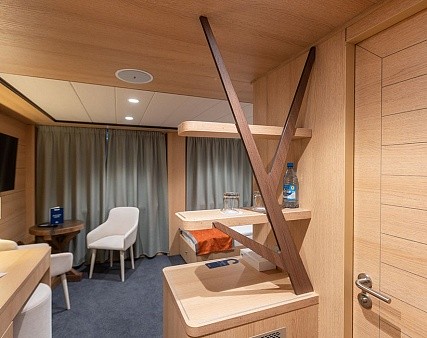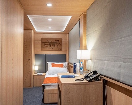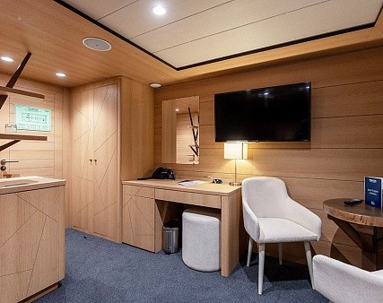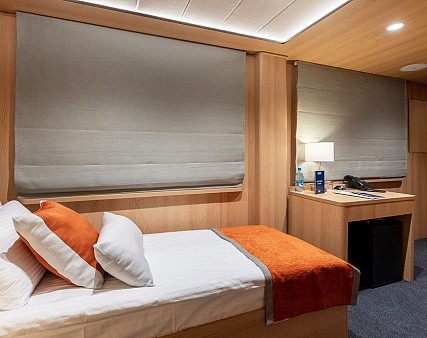 В каюте: односпальная кровать, шкаф для одежды, радио, кондиционер, телевизор, холодильник, фен, сейф, душ, санузел, обзорное окно, электророзетка на 220V.