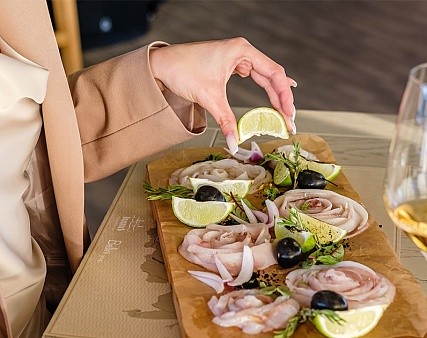- Завтрак, обед – заказная система, фиксированная рассадка с элементами шведского стола (фрукты, десерты, соусы) и включенными напитками (вода, чай, кофе, домашний морс, сок) без ограничения;