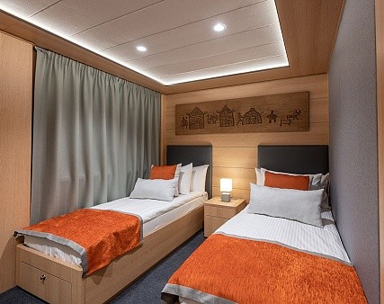 в каютах №101-118 — две односпальные кровати (можно сдвинуть), площадь каюты 17,7 м2;