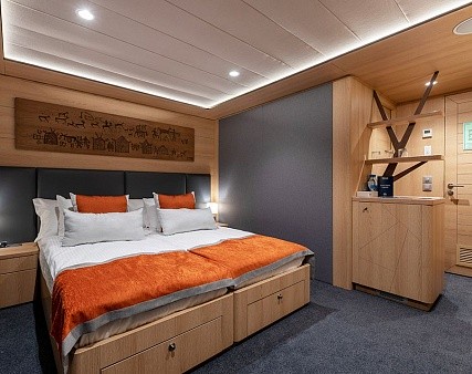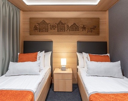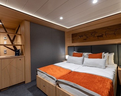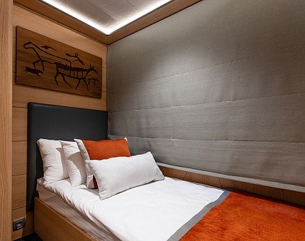 Площадь 12,5 м2. Однокомнатная каюта с удобствами (душ, санузел, кондиционер) рассчитана на размещение до двух человек.
