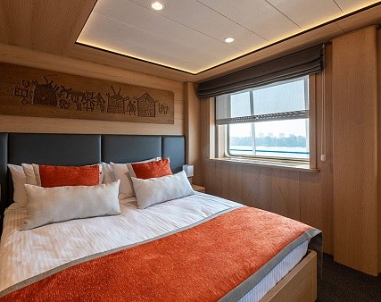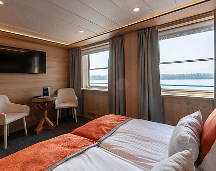 Площадь до 18,9 м2. Однокомнатная каюта с удобствами (душ, санузел, кондиционер) рассчитана на размещение до двух человек.