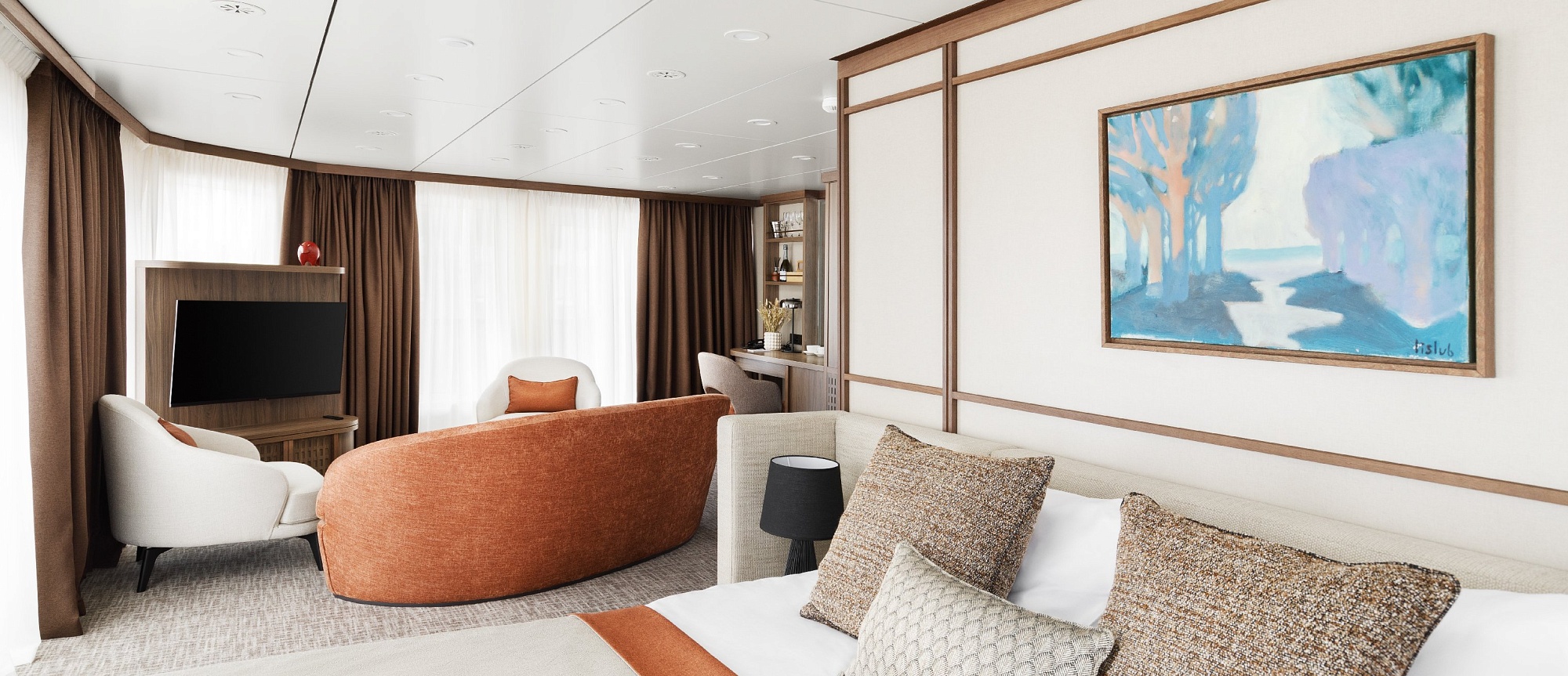 В каюте: терраса, двуспальная кровать, прикроватные тумбы, диван и два кресла, журнальный стол, туалетный столик, стул, шкаф, телевизор, холодильник, капсульная кофемашина (1 капсула в день на человека (по количеству гостей в каюте), чайник, радио, телефон, санузел с душем, кондиционер, фен, сейф, электророзетка на 220V.