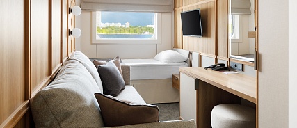 В каюте: две односпальные кровати (можно сдвинуть), прикроватные тумбы, туалетный столик, стул, шкаф, телевизор, холодильник, капсульная кофемашина (1 капсула в день на человека (по количеству гостей в каюте), чайник, радио, телефон, обзорное окно, душ, санузел, кондиционер, фен, сейф, халаты, электророзетка на 220V.