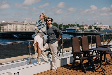 - Ужин — заказная система питания (выбор блюд со 2-го дня круиза), фиксированная рассадка. Включённые напитки (без ограничения): вода, чай, кофе, домашний морс. На выбор: вино красное / белое / игристое (1 бокал, 125 мл) / водка (1 рюмка 50 мл) / пиво (1 бокал, 300 мл).