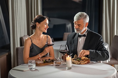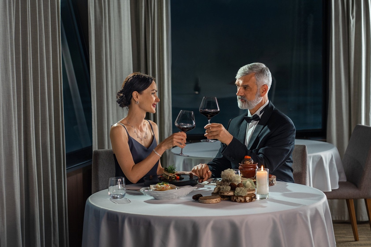 - Ужин — заказная система питания (выбор блюд со 2-го дня круиза), фиксированная рассадка. Включённые напитки (без ограничения): вода, чай, кофе, домашний морс. На выбор: вино красное / белое / игристое (1 бокал, 125 мл) / водка (1 рюмка 50 мл) / пиво (1 бокал, 300 мл).