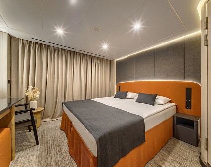 В каюте: двуспальная кровать (раздвигается), прикроватные тумбы, окно (не открывается), кресло, журнальный столик, письменный стол, шкаф для одежды, кондиционер, спутниковое ТВ, холодильник, розетки 220V, телефон, радио, фен, капсульная кофемашина, электрочайник, сейф, душ, санузел. Каждый номер оборудован межкомнатной звукоизоляционной дверью и оснащен качественной функциональной мебелью и современной бытовой техникой. Площадь 18,23 м2