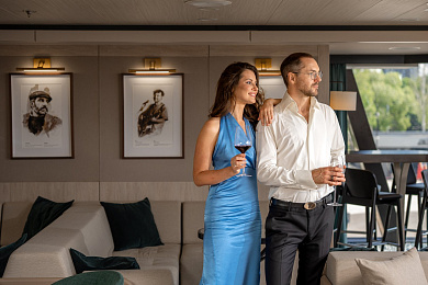 В каюте: двуспальная кровать (раздвигается), прикроватные тумбы, кресло, журнальный столик, письменный стол, шкаф для одежды, кондиционер, телевизор, холодильник, розетки 220V, телефон, радио, фен, капсульная кофемашина, электрочайник, сейф, душ, санузел. Площадь каюты 21 м2