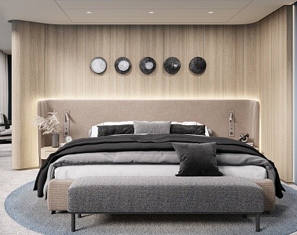 В каюте: двуспальная кровать, прикроватные тумбы, журнальный столик, письменный стол, гардероб диван, кресло, панорамные окна, телевизор, шкаф для одежды, холодильник, кондиционер, розетки 220V, телефон, радио, фен, капсульная кофемашина, электрочайник, cейф, душ, санузел. Площадь каюты 42,9 м2