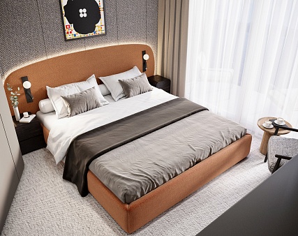 В спальне: двуспальная кровать, прикроватные тумбы, фен, телевизор, панорамное окно, письменный стол, книжный стеллаж, кресло душ, санузел.