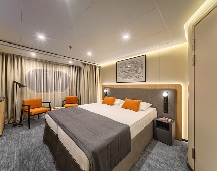 В каюте: двуспальная кровать (раздвигается), прикроватные тумбы, окно (не открывается), кресло, журнальный столик, письменный стол, шкаф для одежды, кондиционер, телевизор, холодильник, розетки 220V, телефон, радио, фен, капсульная кофемашина, электрочайник, сейф, душ, санузел. Площадь каюты 17,6 м2