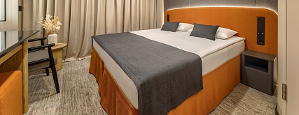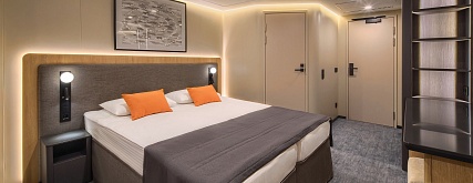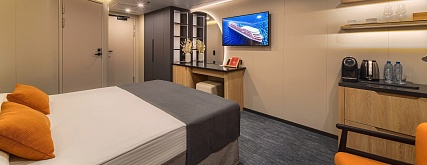В каюте: двуспальная кровать (раздвигается), прикроватные тумбы, кресло, журнальный столик, письменный стол, шкаф для одежды, кондиционер, телевизор, холодильник, розетки 220V, телефон, радио, фен, капсульная кофемашина, электрочайник, сейф, душ, санузел. Площадь каюты 13,9 м2