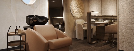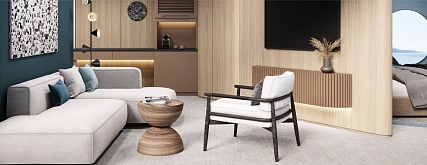 В каюте: двуспальная кровать, прикроватные тумбы, журнальный столик, письменный стол, гардероб диван, кресло, панорамные окна, телевизор, шкаф для одежды, холодильник, кондиционер, розетки 220V, телефон, радио, фен, капсульная кофемашина, электрочайник, cейф, душ, санузел. Площадь каюты 42,9 м2