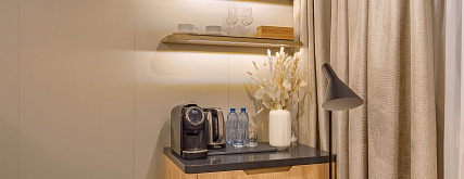 В каюте: двуспальная кровать (раздвигается), прикроватные тумбы, кресло, журнальный столик, письменный стол, шкаф для одежды, кондиционер, телевизор, холодильник, розетки 220V, телефон, радио, фен, капсульная кофемашина, электрочайник, сейф, душ, санузел. Площадь каюты 21 м2