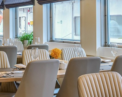- Обед – заказная система питания (выбор блюд со 2-го дня круиза) с элементами шведского стола (салат-бар, хлебная станция, фрукты). Включенные напитки (без ограничения): вода, чай, кофе. На выбор: вино красное / белое / игристое (1 бокал, 125 мл.) / водка (1 рюмка, 50 мл.) / пиво (1 бокал, 300 мл.) / домашний морс (1 бокал, 200 мл.). Фиксированная рассадка;