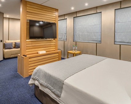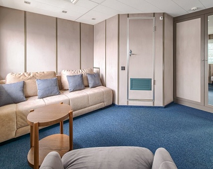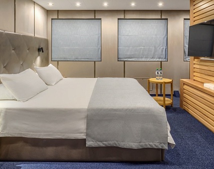 В каюте: двуспальная кровать, диван, кресло, шкаф для одежды, журнальный стол, телевизор, холодильник, фен, радио, сейф, четыре обзорных окна, электророзетка на 220V.