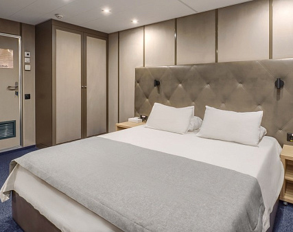В каютах 403, 405-409, 412, 414, 419-422 (шлюпочная палуба), 323-334, 341-344 (средняя палуба) — двуспальная кровать размером 160х200 см, площадь каюты 15,5 м2