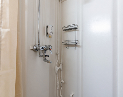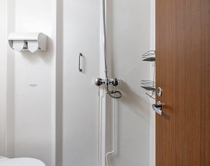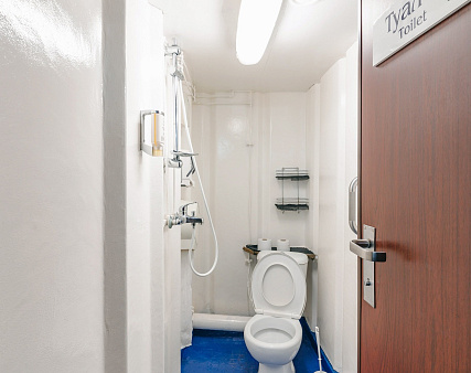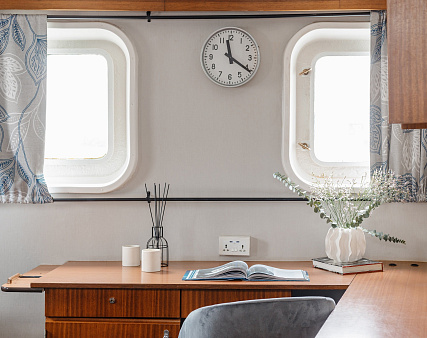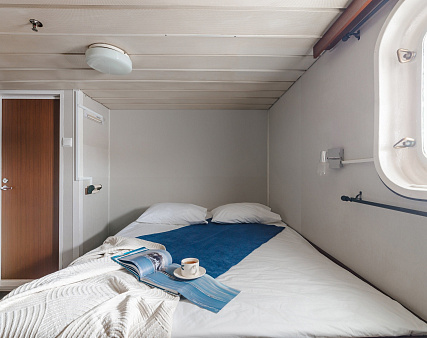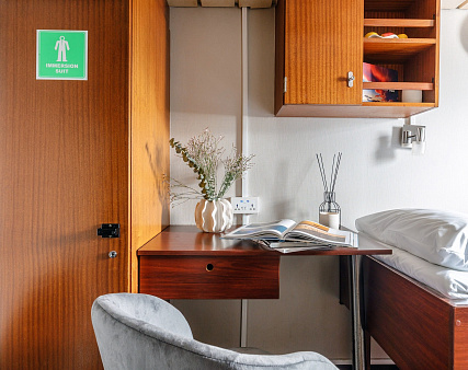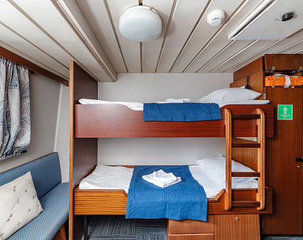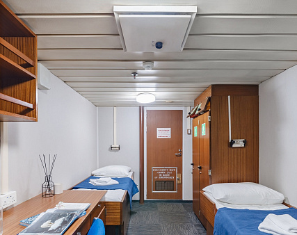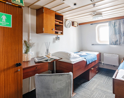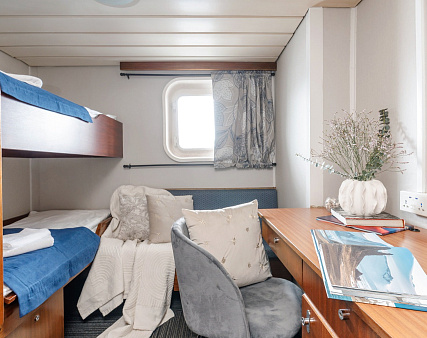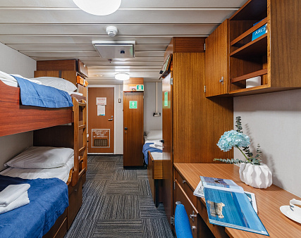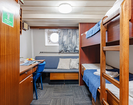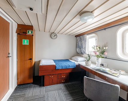 В каюте: окна, два спальных места (нижнее и верхнее), письменный стол, шкаф, тумбочки и собственные туалет и душ.