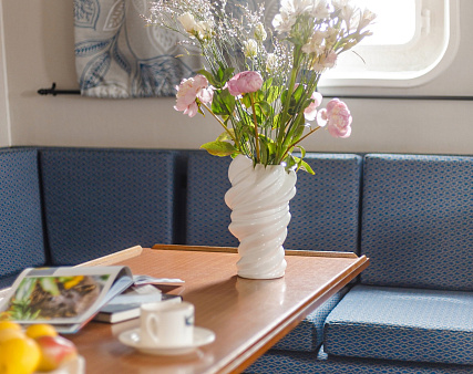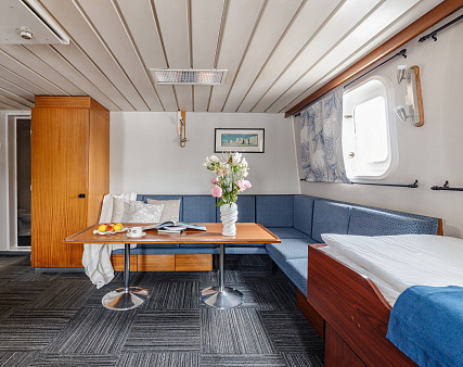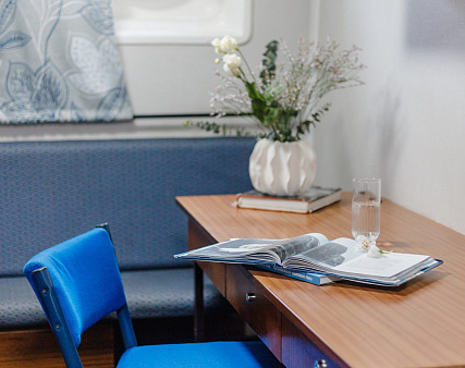 В каюте: окно, два спальных места, письменный стол, шкаф, тумбочки и умывальник (удобства совмещенные). В каюте 321 возможно размещение третьего человека на дополнительном спальном месте.