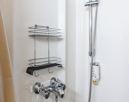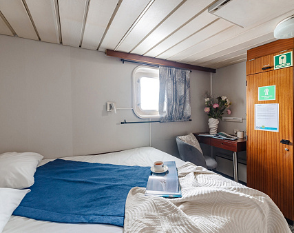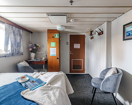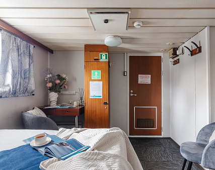 В каюте: окно, два спальных места (нижние), письменный стол, шкаф, тумбочки и собственные туалет и душ.