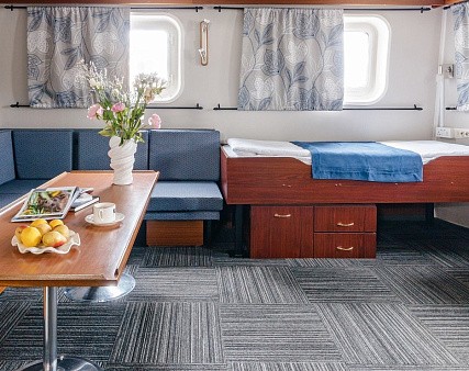 В каюте: окна на две стороны, двуспальная кровать в отдельной зоне +1 односпальная кровать, гостиная с диваном, письменный стол, шкаф, тумбочки и собственные туалет и душ.