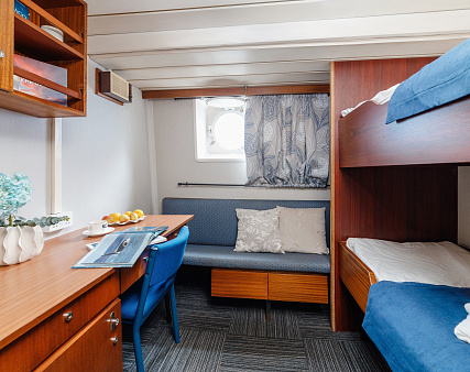 В каюте: окна, два спальных места (нижнее и верхнее), письменный стол, шкаф, тумбочки и собственные туалет и душ.