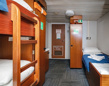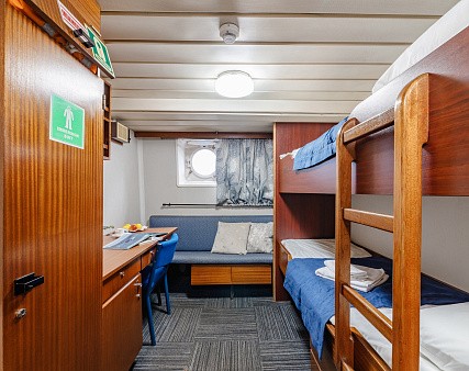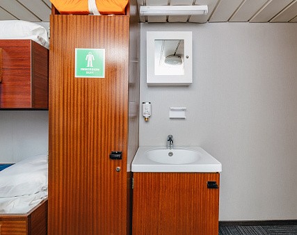 В каюте: окна, два спальных места (нижнее и верхнее), письменный стол, шкаф, тумбочки и собственные туалет и душ.
