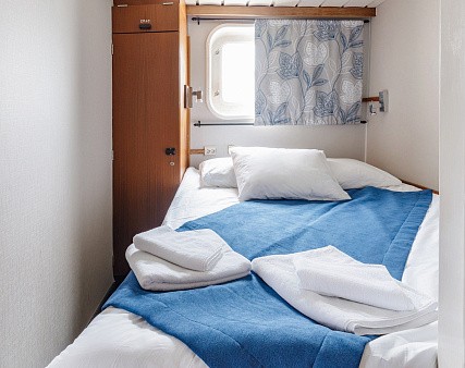 В каюте: окно, два спальных места, письменный стол, шкаф, тумбочки и умывальник (удобства совмещенные). В каюте 321 возможно размещение третьего человека на дополнительном спальном месте.