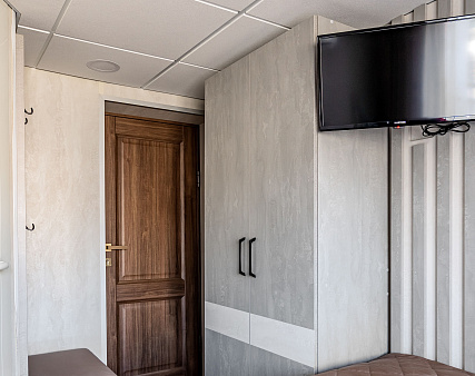 В каюте: односпальная кровать, ванная комната (раковина, душ, туалет), шкаф, тумба, стул, стол, телевизор с приемом спутниковых каналов, холодильник, фен, плед для каждого туриста, розетка 220 V, щетка для одежды, обзорное окно.