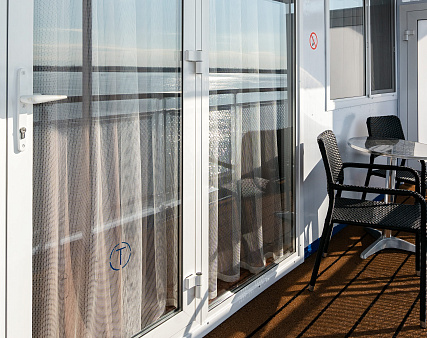 В каюте: односпальная кровать, ванная комната (раковина, душ, туалет), прикроватная тумба, стол письменный, пуф/стул, шкаф для одежды, вешалка для верхней одежды, зеркало, холодильник, кондиционер, радио, сейф, фен, телевизор с кабельным и спутниковым вещанием, розетки 220 V, обзорное окно, индивидуальный балкон с мебелью для отдыха.