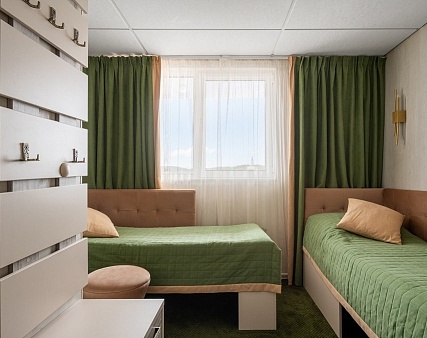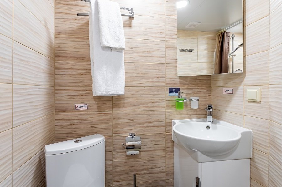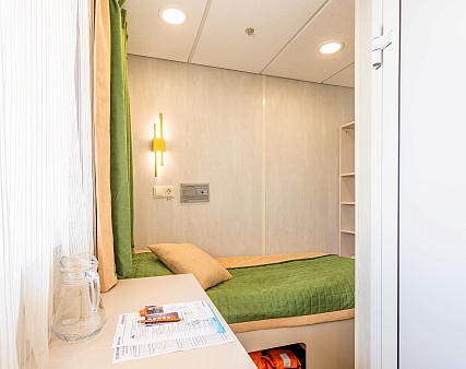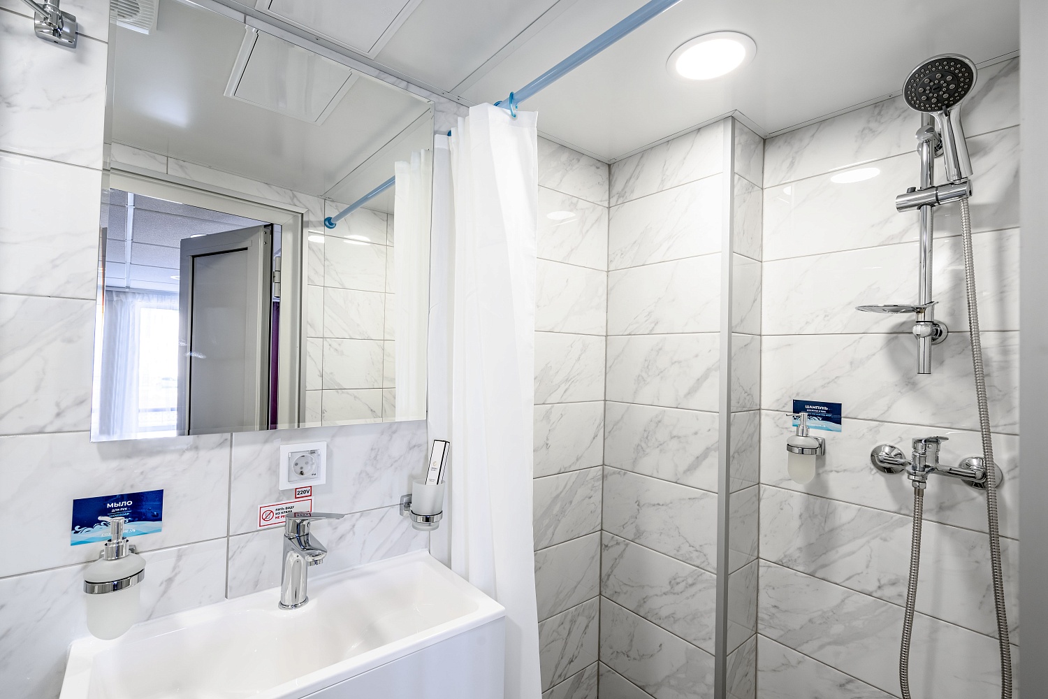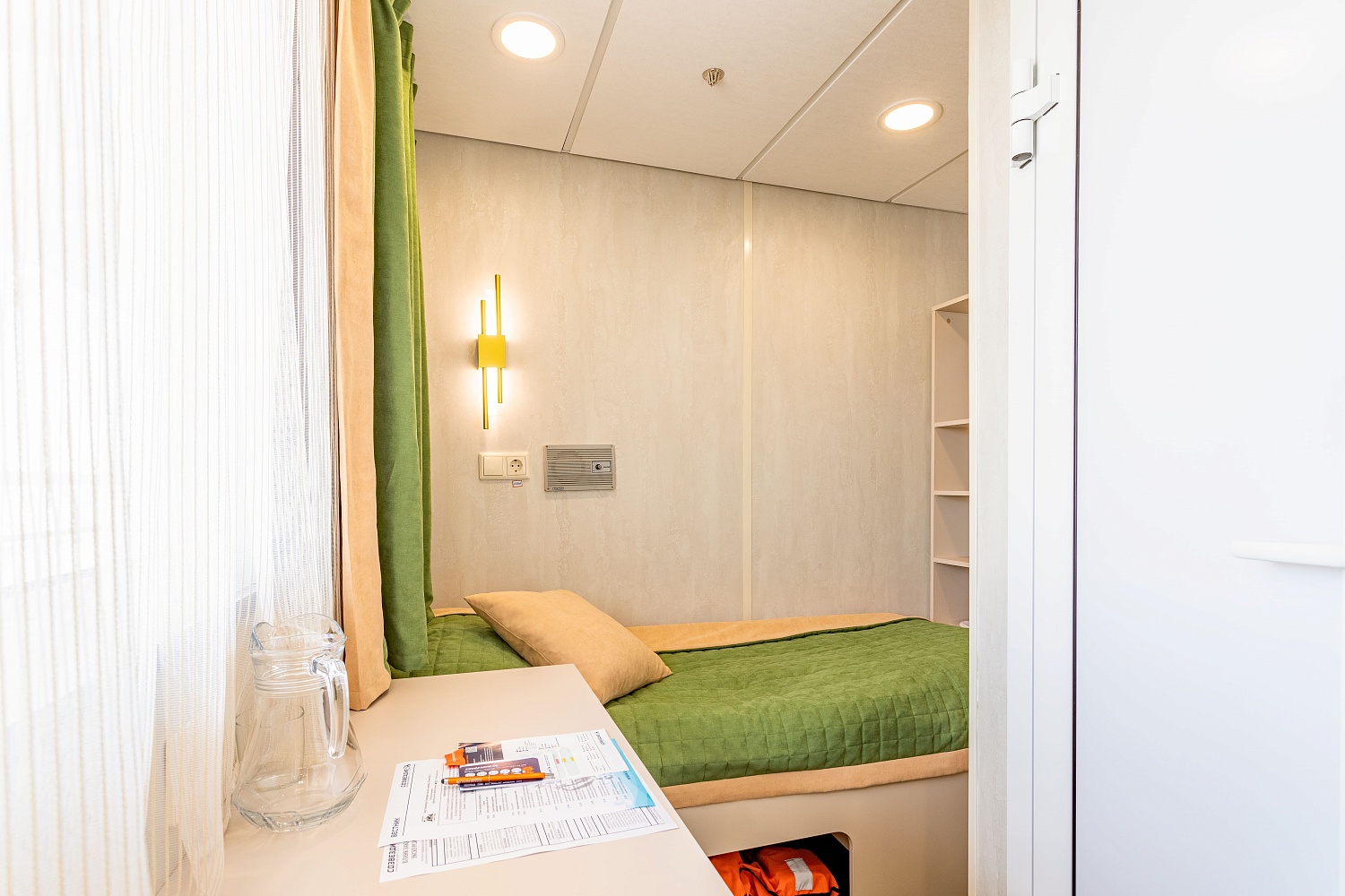 В каюте: две односпальные кровати, тумбочка, шкаф для одежды, стол, мягкий пуф, вешалка для верхней одежды, зеркало, радио, телевизор с кабельным и спутниковым вещанием, телефон, холодильник, ванная комната (раковина, душ, туалет), фен, пледы, щетка для одежды, розетки 220 V, кондиционер, обзорное окно.