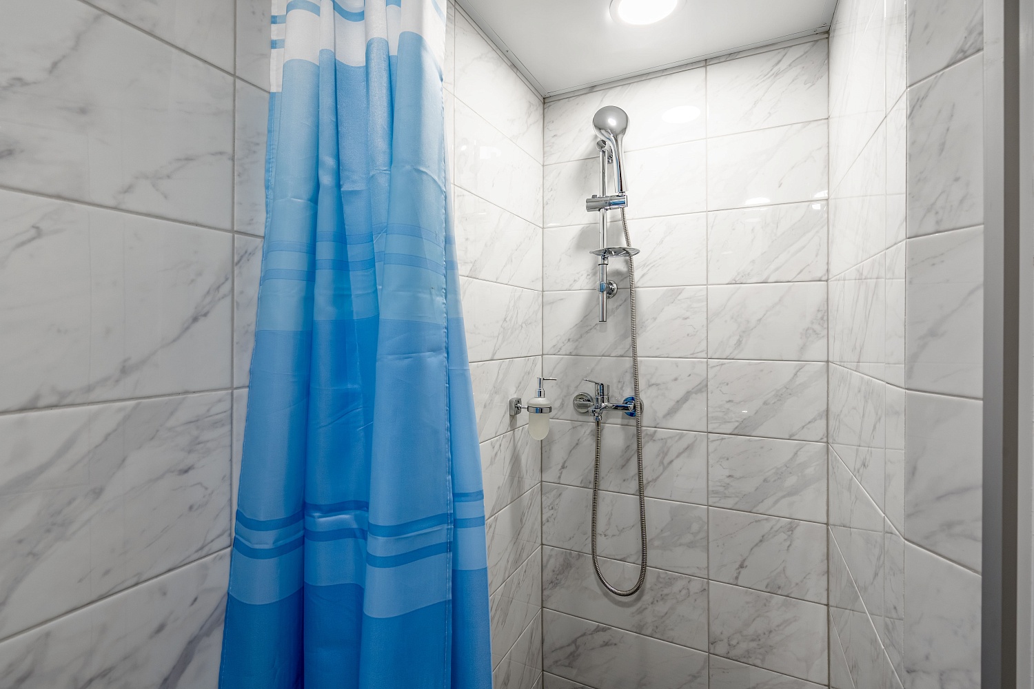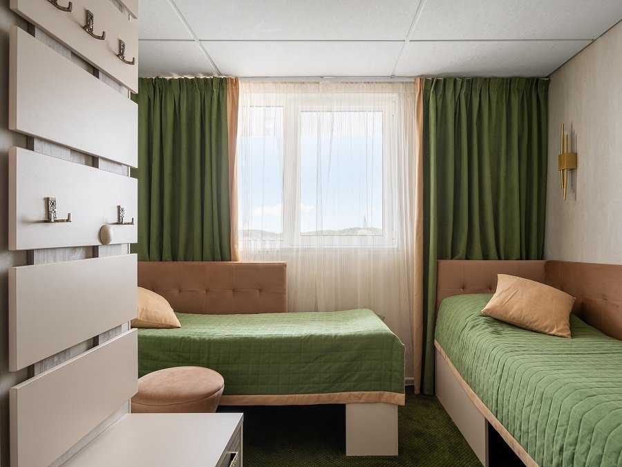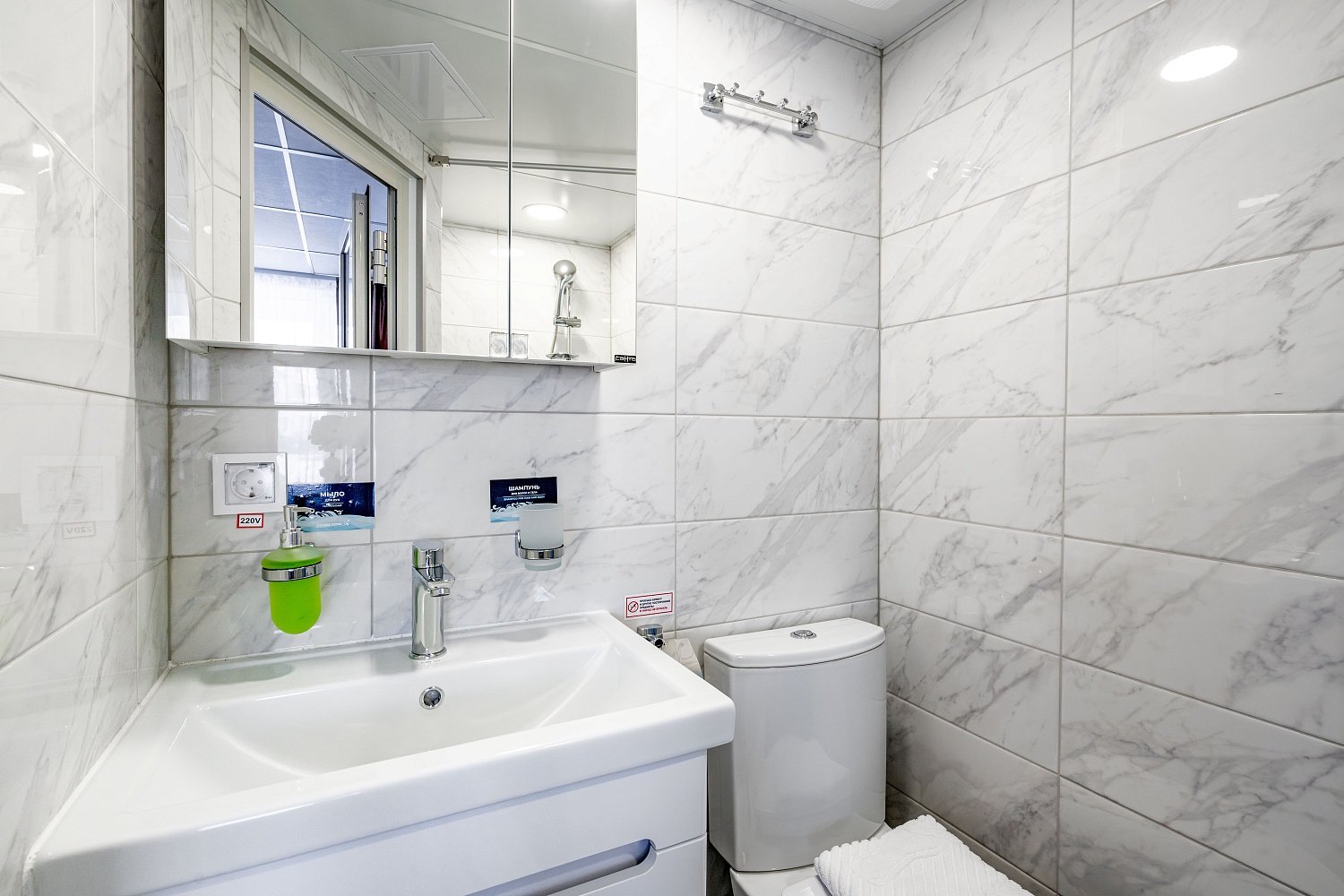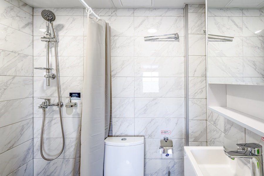 В каюте: две односпальные кровати, тумбочка, шкаф для одежды, стол, мягкий пуф, вешалка для верхней одежды, зеркало, радио, телевизор с кабельным и спутниковым вещанием, телефон, холодильник, ванная комната (раковина, душ, туалет), фен, пледы, щетка для одежды, розетки 220 V, кондиционер, обзорное окно.