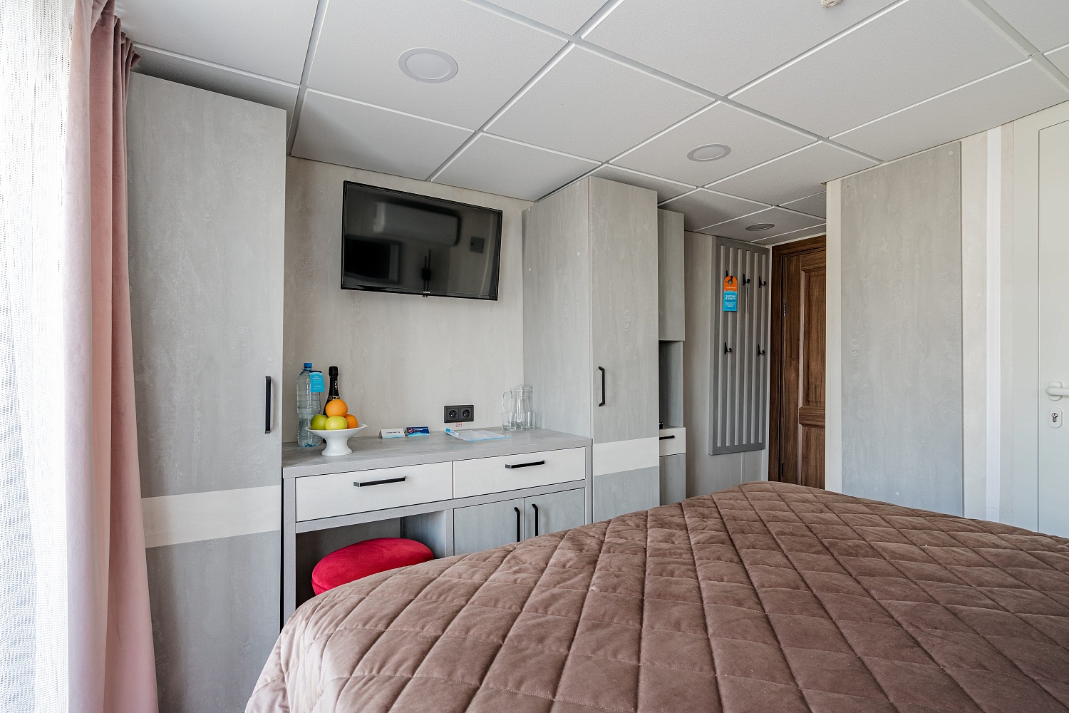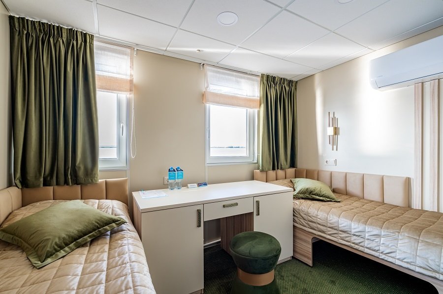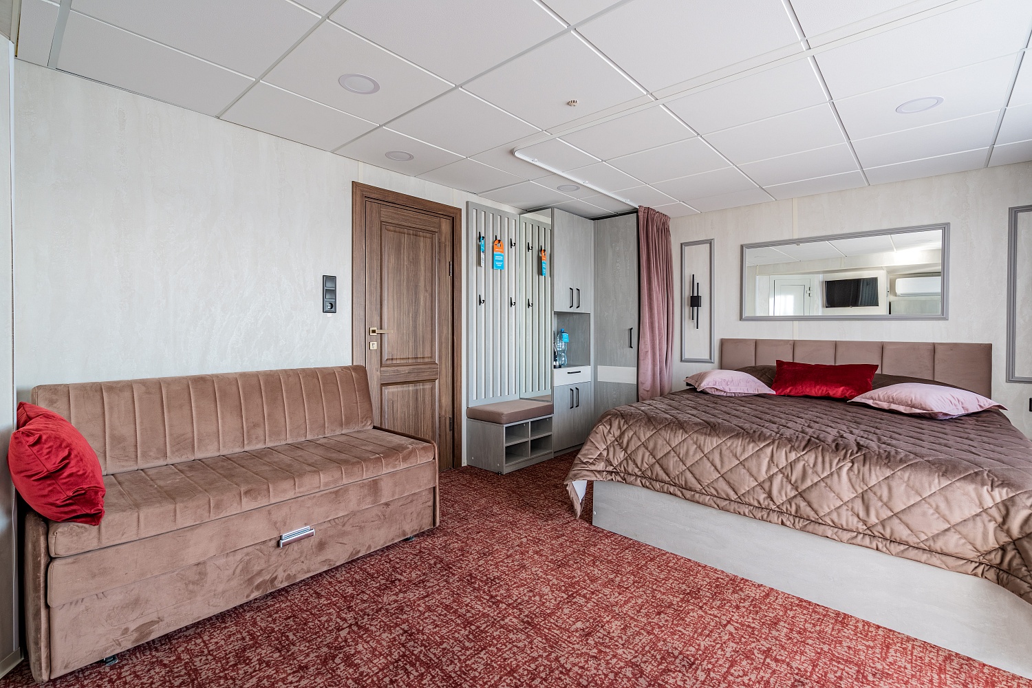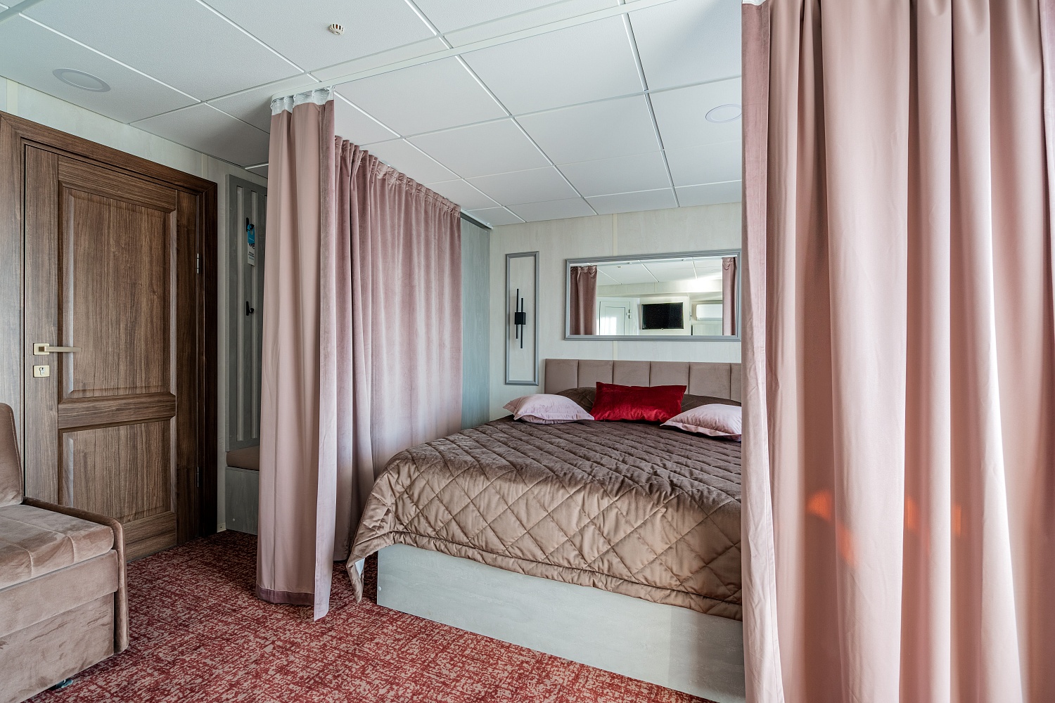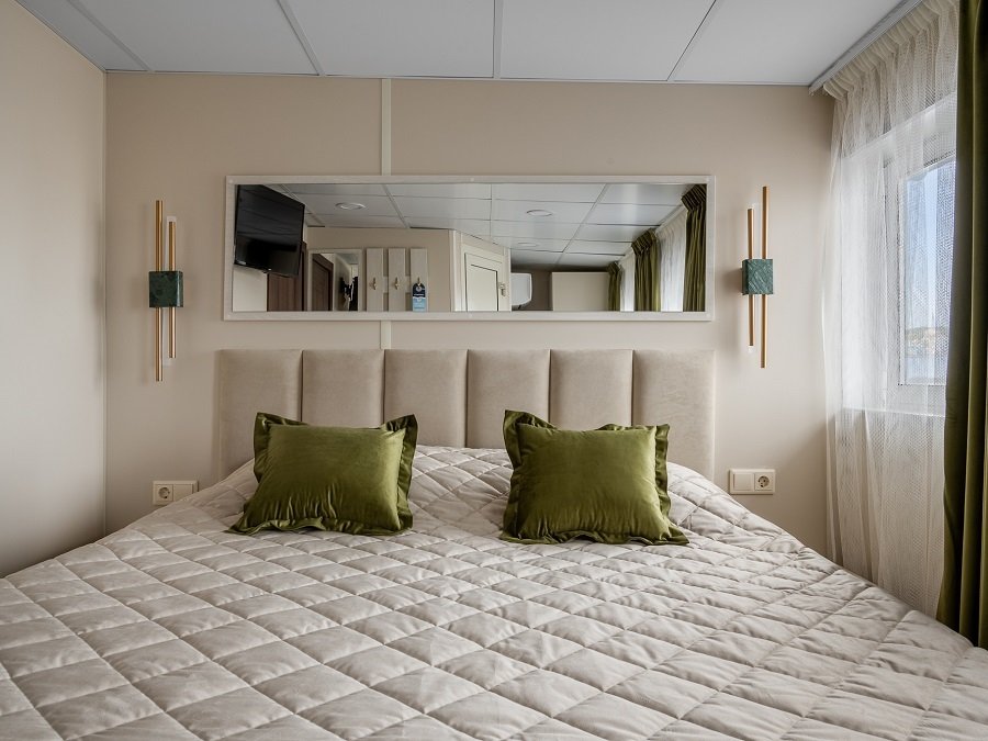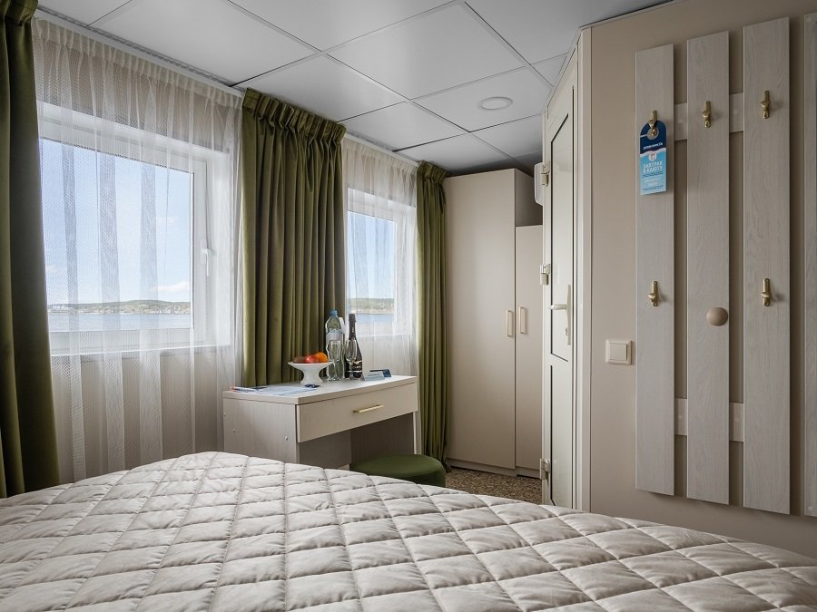 В каюте: одна двуспальная кровать (при необходимости трансформируется в две односпальные кровати), 2 прикроватные тумбы, стол письменный, стул, банкетка, шкаф, вешалка для верхней одежды, зеркало, холодильник, ванная комната (раковина, душ, туалет), кондиционер, радио, сейф, фен, плед для каждого туриста, телевизор с кабельным и спутниковым вещанием, розетки 220 V, обзорное окно.