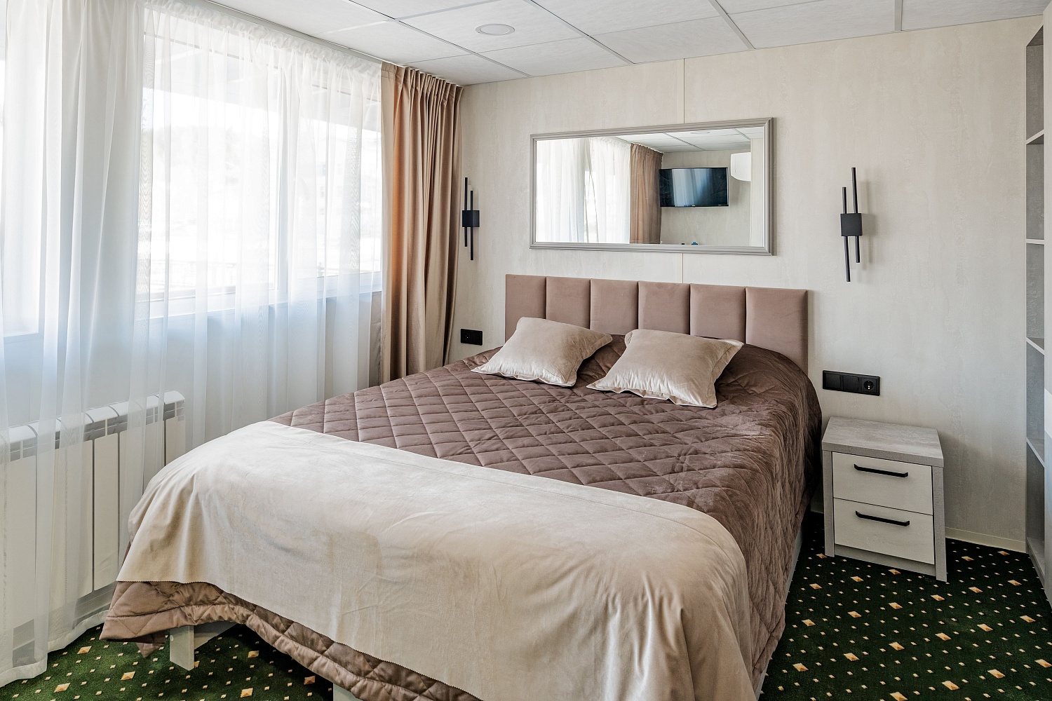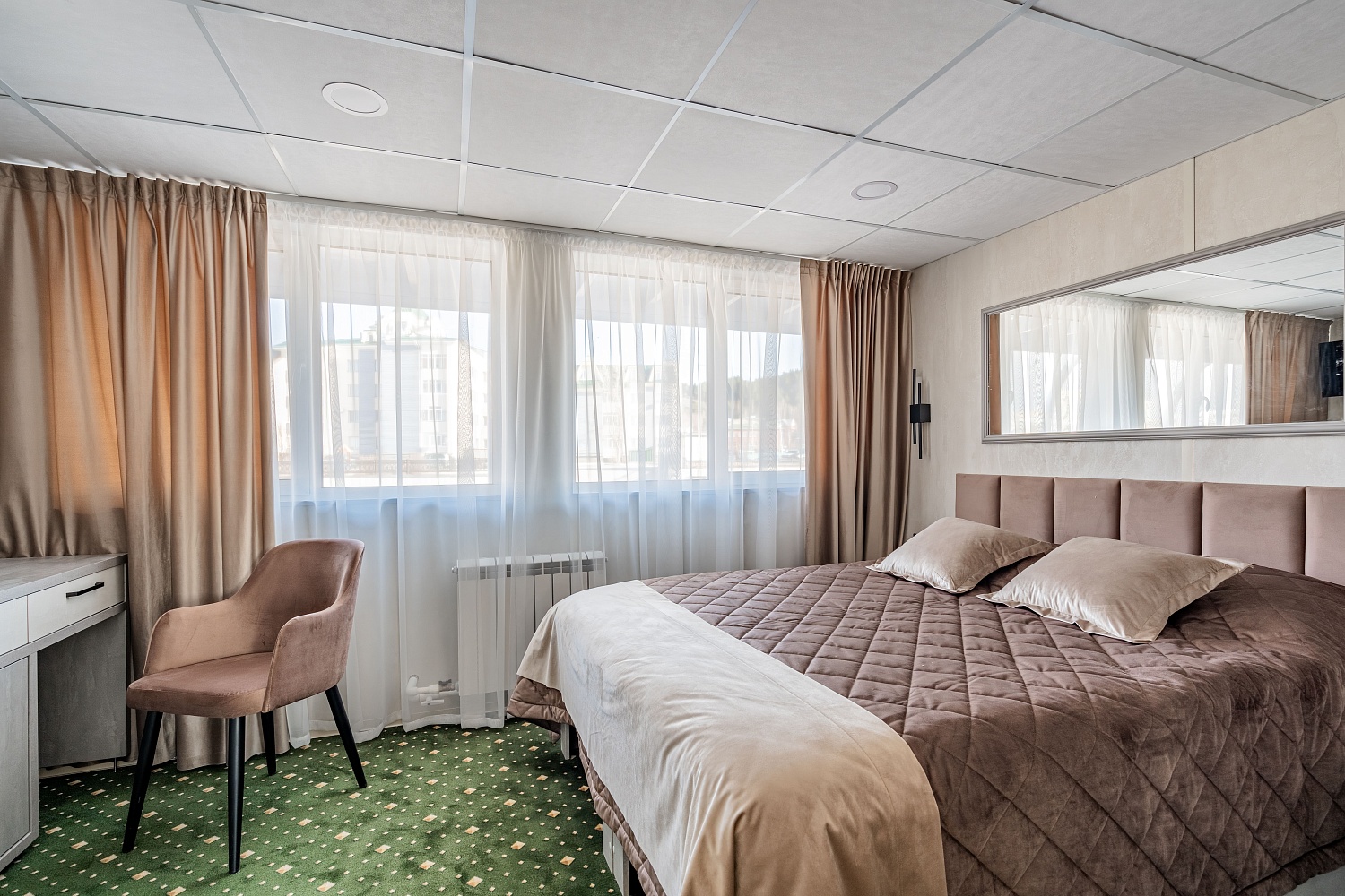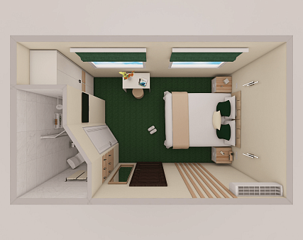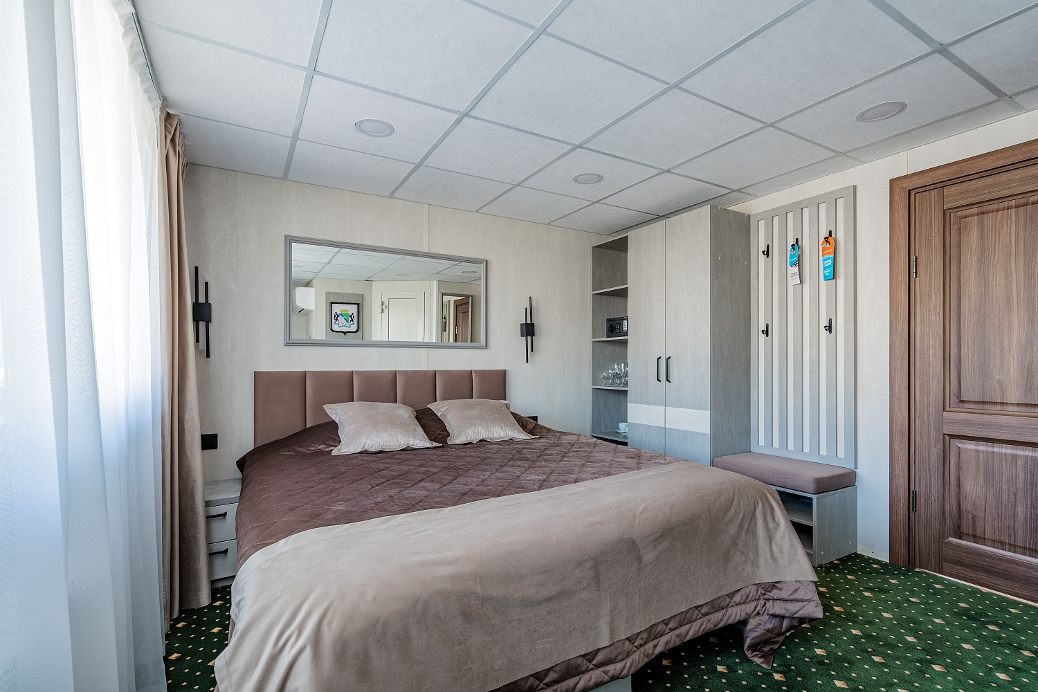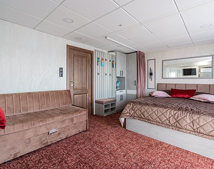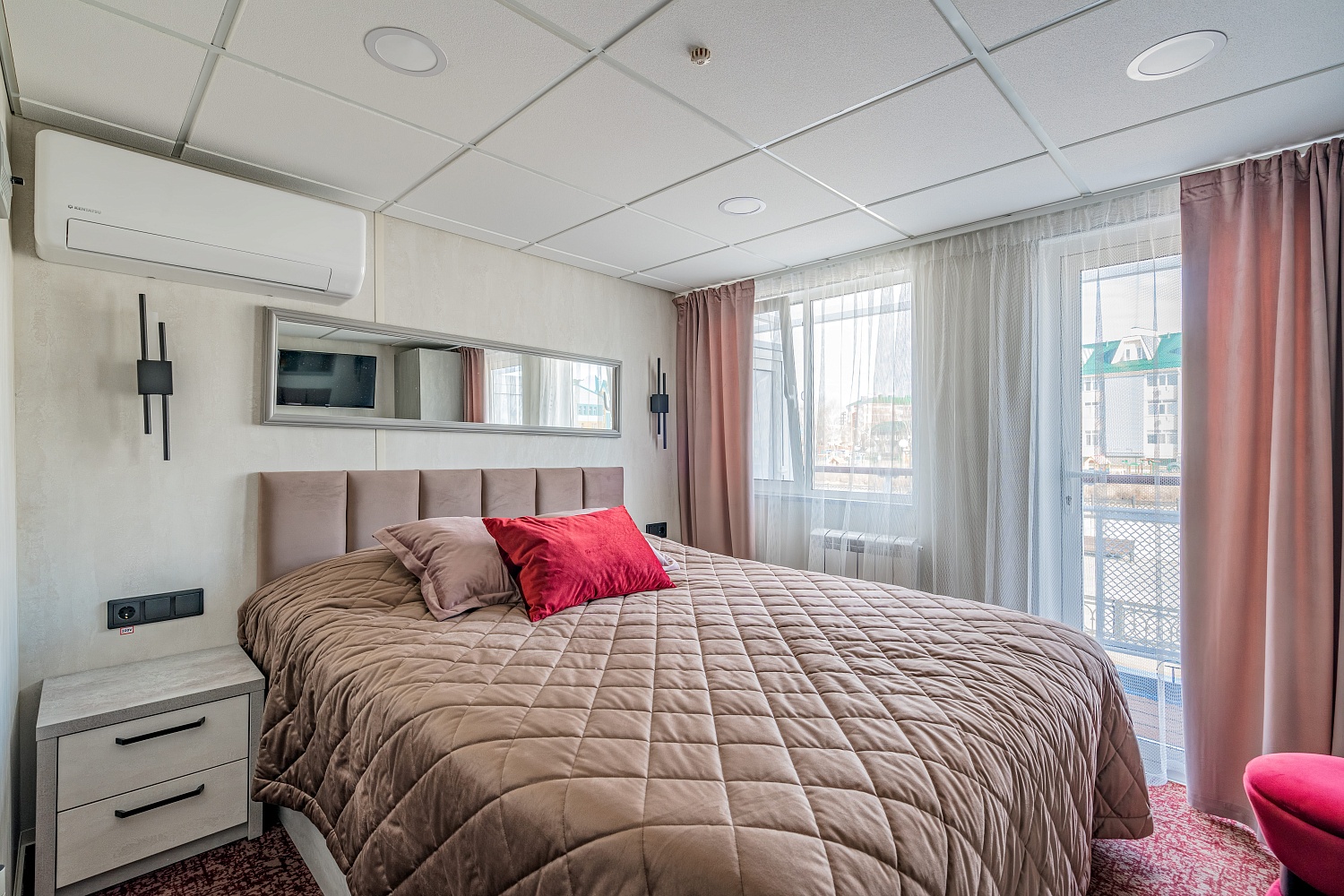 В каюте: одна двуспальная кровать (при необходимости трансформируется в две односпальные кровати), 2 прикроватные тумбы, стол письменный, стул, банкетка, шкаф, вешалка для верхней одежды, зеркало, холодильник, ванная комната (раковина, душ, туалет), кондиционер, радио, сейф, фен, плед для каждого туриста, телевизор с кабельным и спутниковым вещанием, розетки 220 V, обзорное окно.