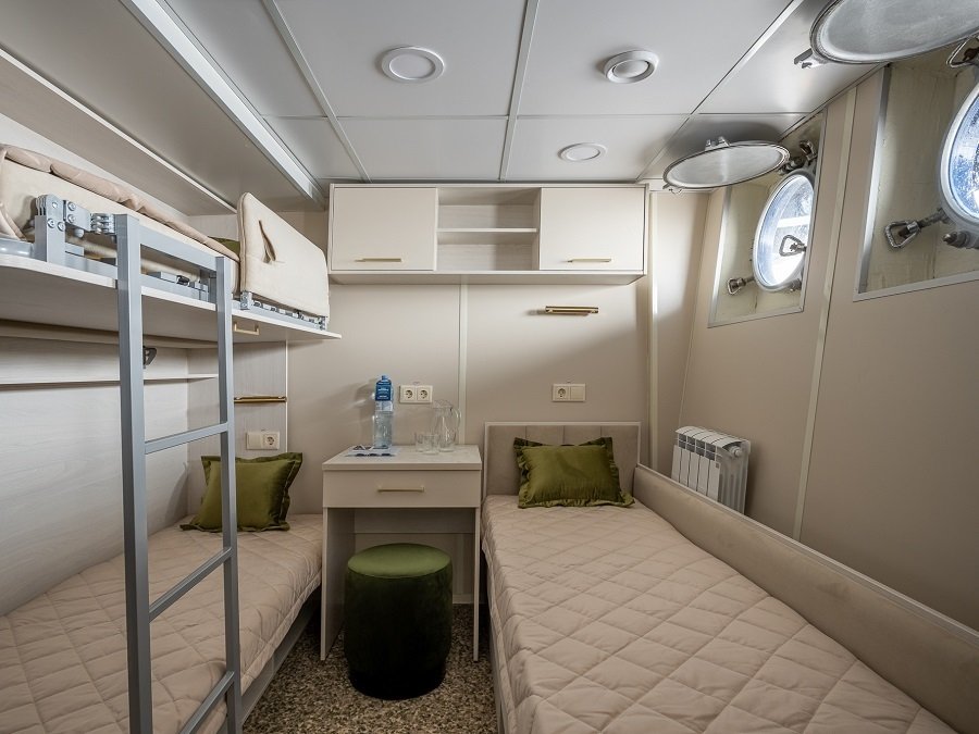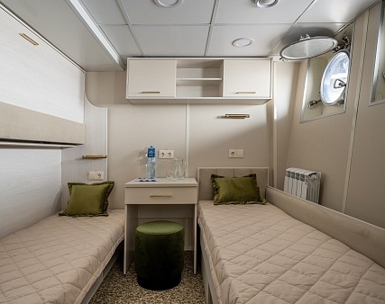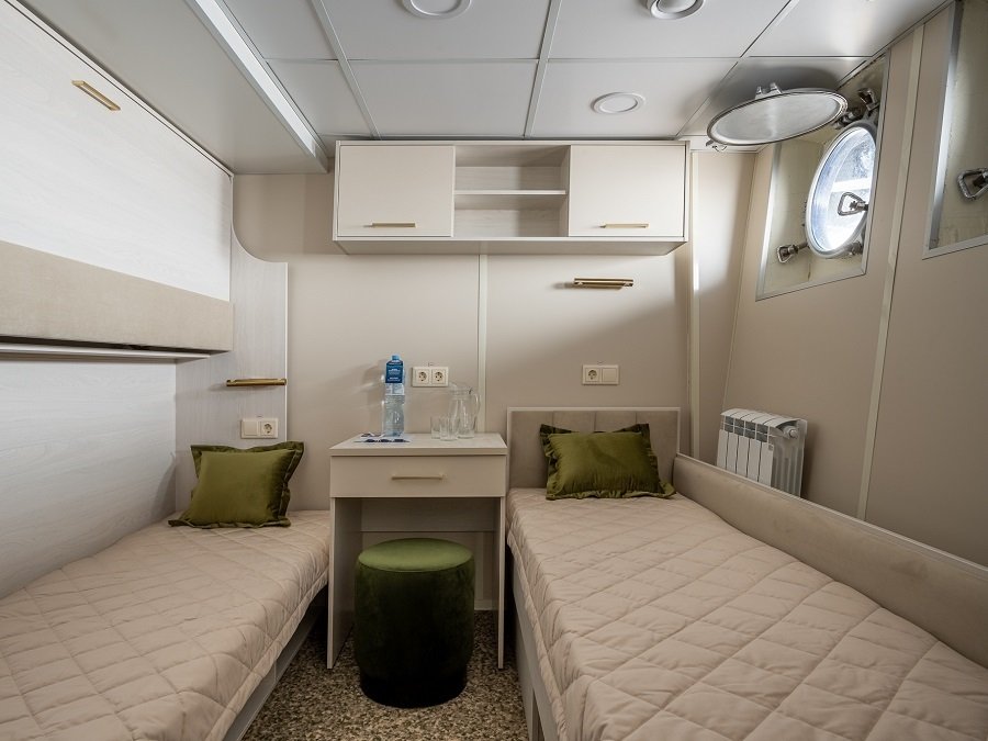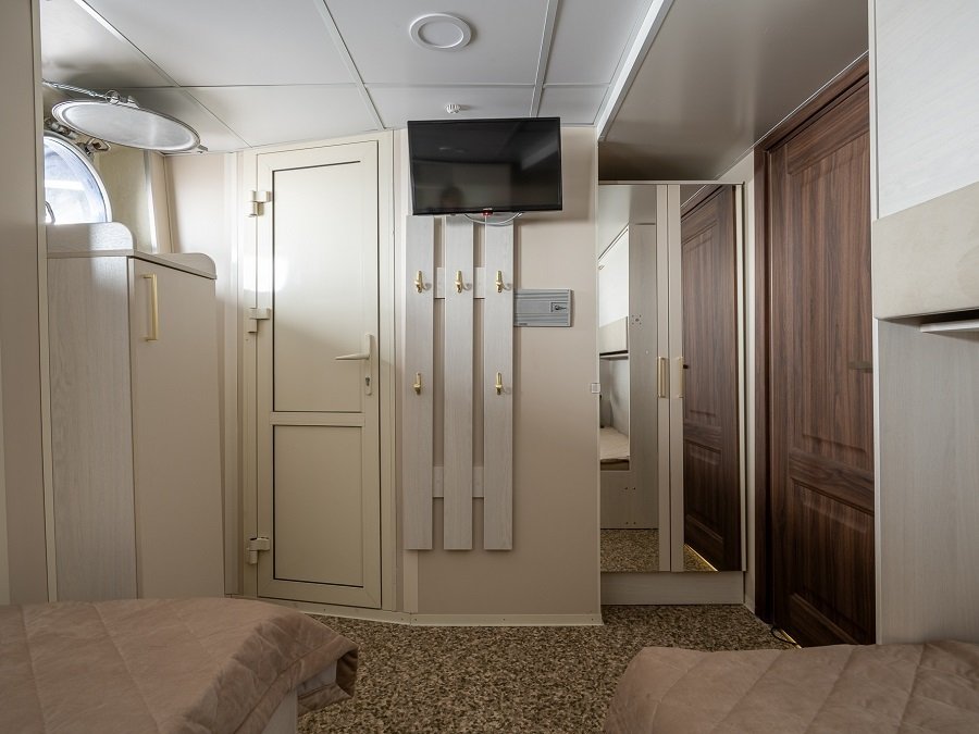 В каюте: две односпальные кровати и одно спальное место верхнего расположения, стол, пуф, зеркало, шкаф, вешалка для верхней одежды, ванная комната (раковина, душ, туалет), телевизор с кабельным и спутниковым вещанием, радио, холодильник, фен, розетки 220 V, иллюминаторы.