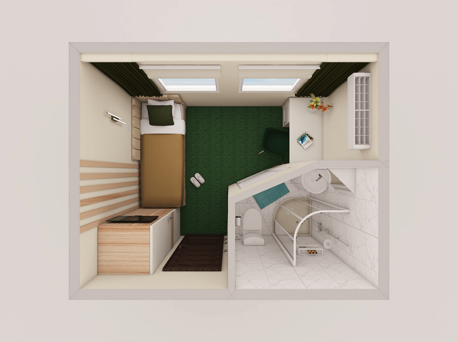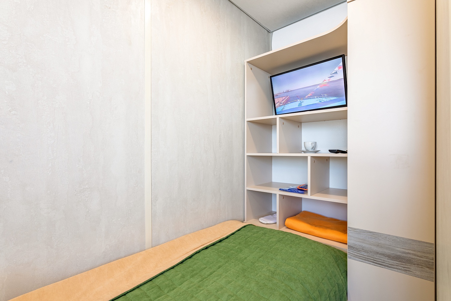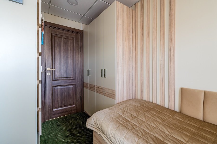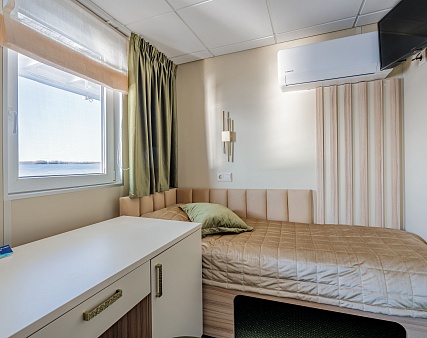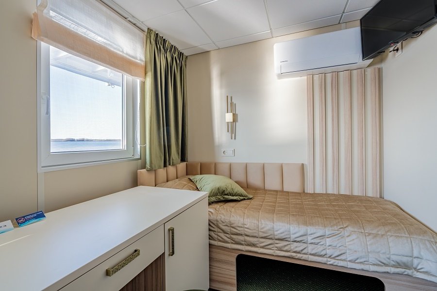 В каюте: односпальная кровать, ванная комната (раковина, душ, туалет), шкаф, тумба, стул, стол, телевизор с приемом спутниковых каналов, холодильник, фен, плед для каждого туриста, розетка 220 V, щетка для одежды, обзорное окно.