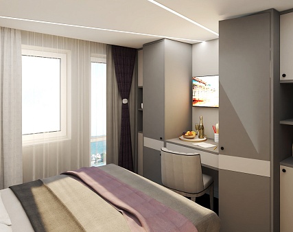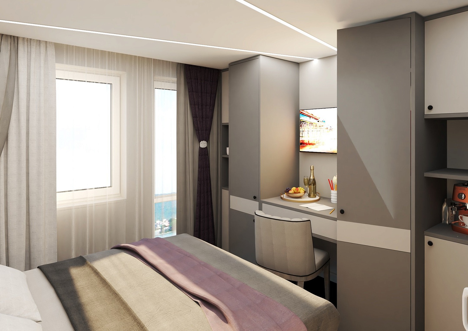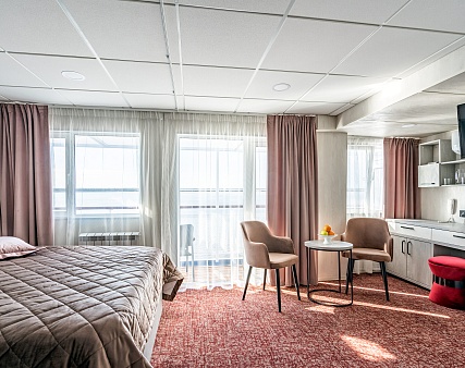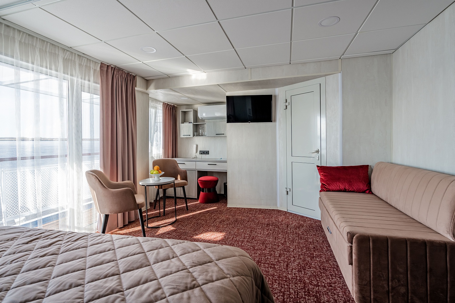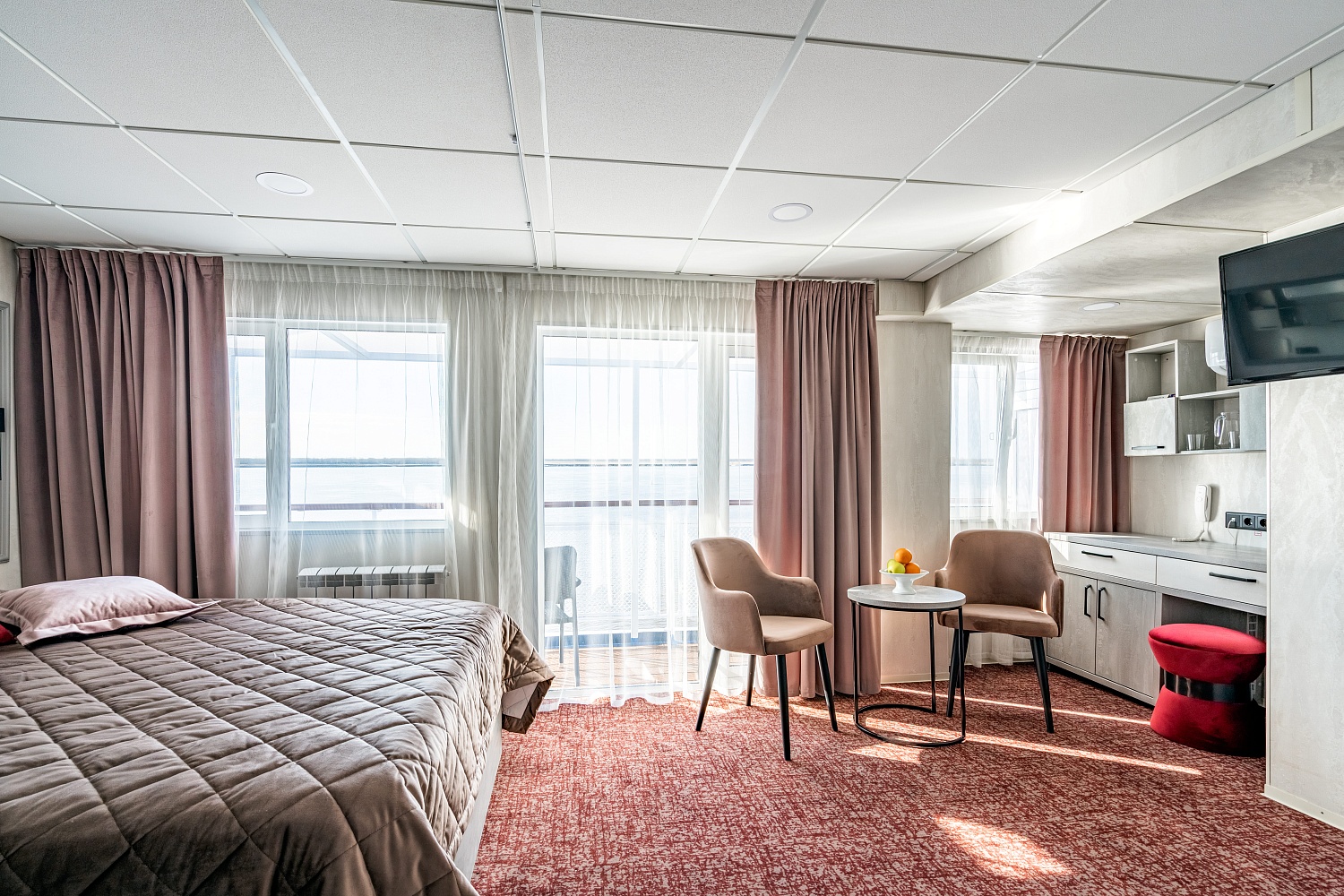 В каюте: одна двуспальная кровать (при необходимости трансформируется в две односпальные кровати), две прикроватные тумбы, два кресла, стол письменный, стол журнальный, пуф, шкаф для одежды, вешалка напольная для верхней одежды, стеллаж или буфет для посуды, зеркало, холодильник, ванная комната (раковина, душ, туалет), кондиционер, радио, сейф, фен, телевизор с кабельным и спутниковым вещанием, розетки 220 V, обзорное окно, балкон с мебелью для отдыха.