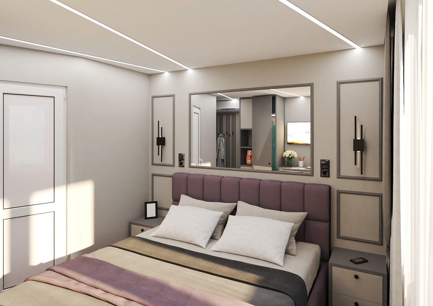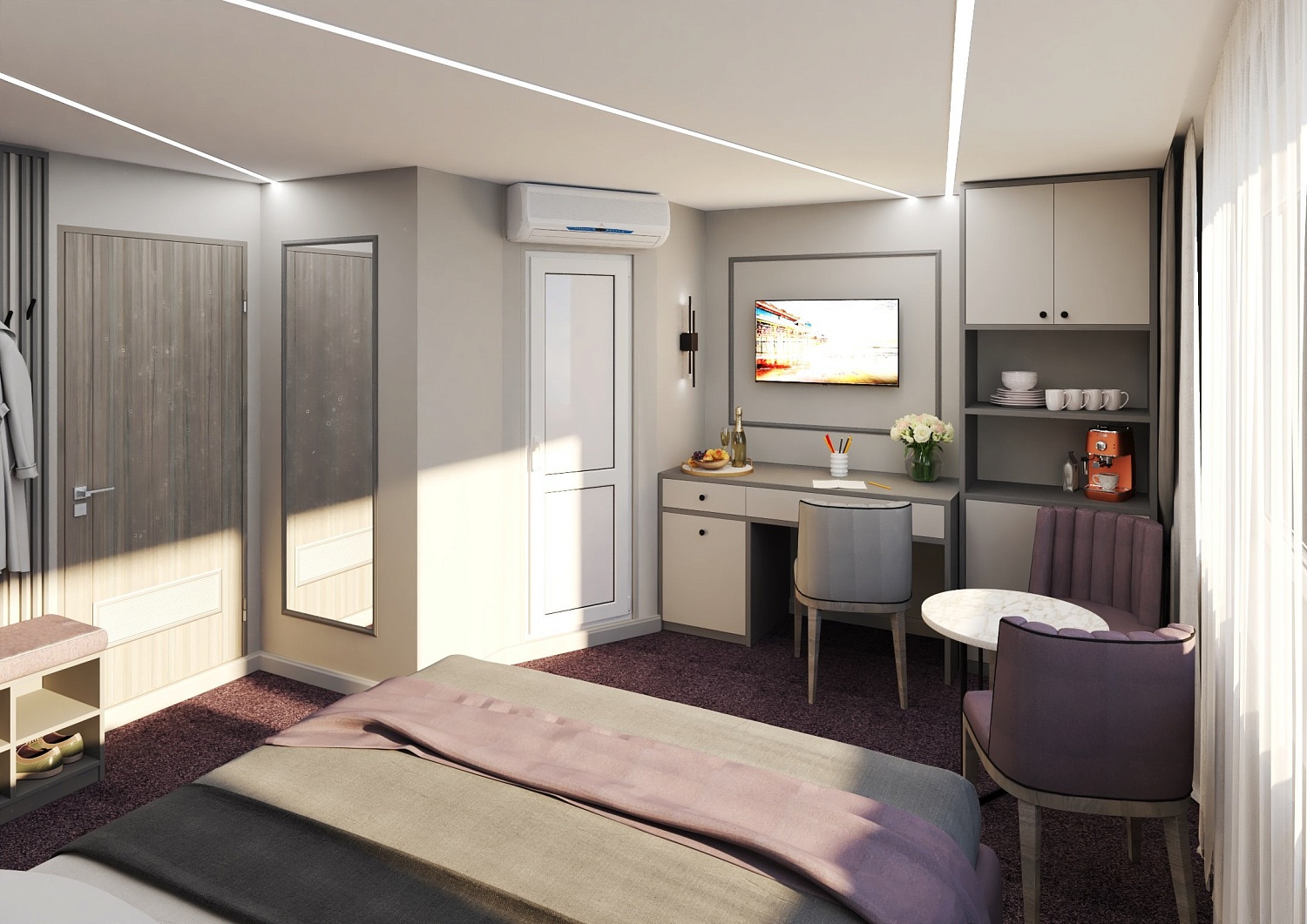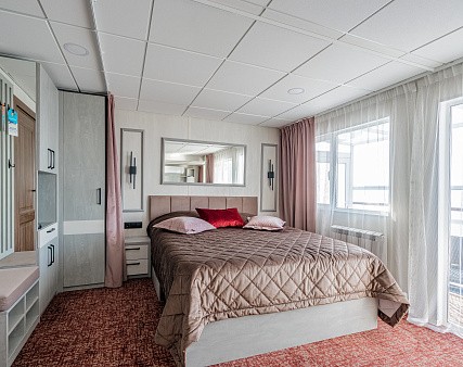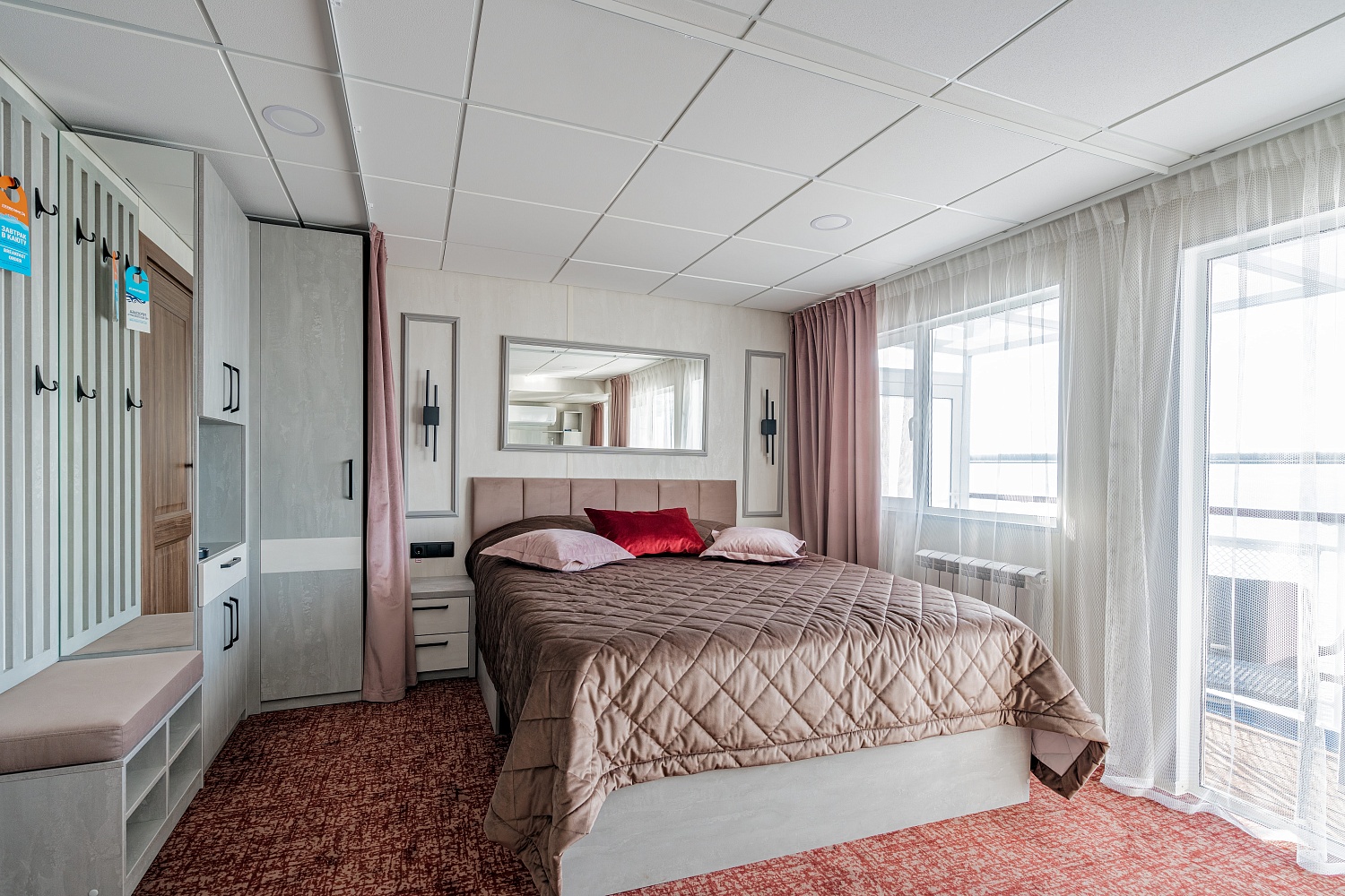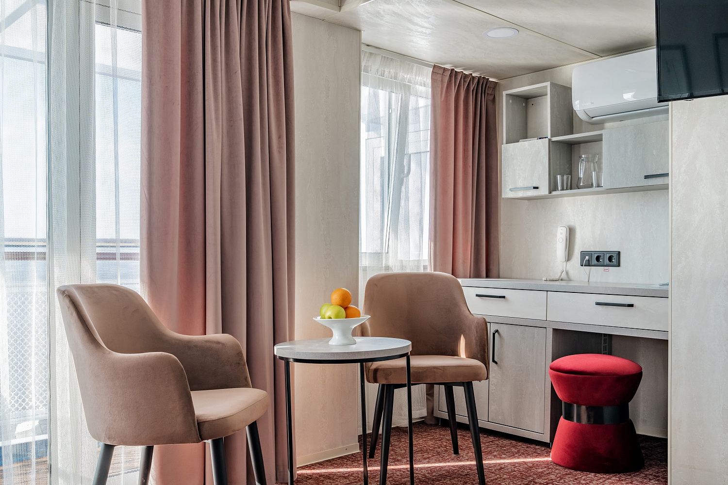 В каюте: одна двуспальная кровать (при необходимости трансформируется в две односпальные кровати), две прикроватные тумбы, два кресла, стол письменный, стол журнальный, пуф, шкаф для одежды, вешалка напольная для верхней одежды, стеллаж или буфет для посуды, зеркало, холодильник, ванная комната (раковина, душ, туалет), кондиционер, радио, сейф, фен, телевизор с кабельным и спутниковым вещанием, розетки 220 V, обзорное окно, балкон с мебелью для отдыха.