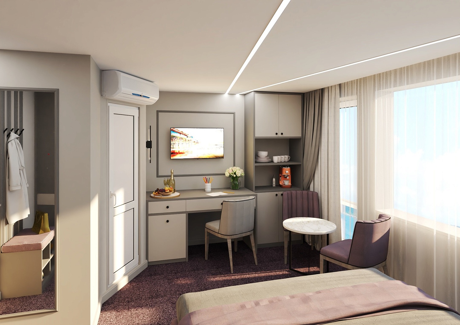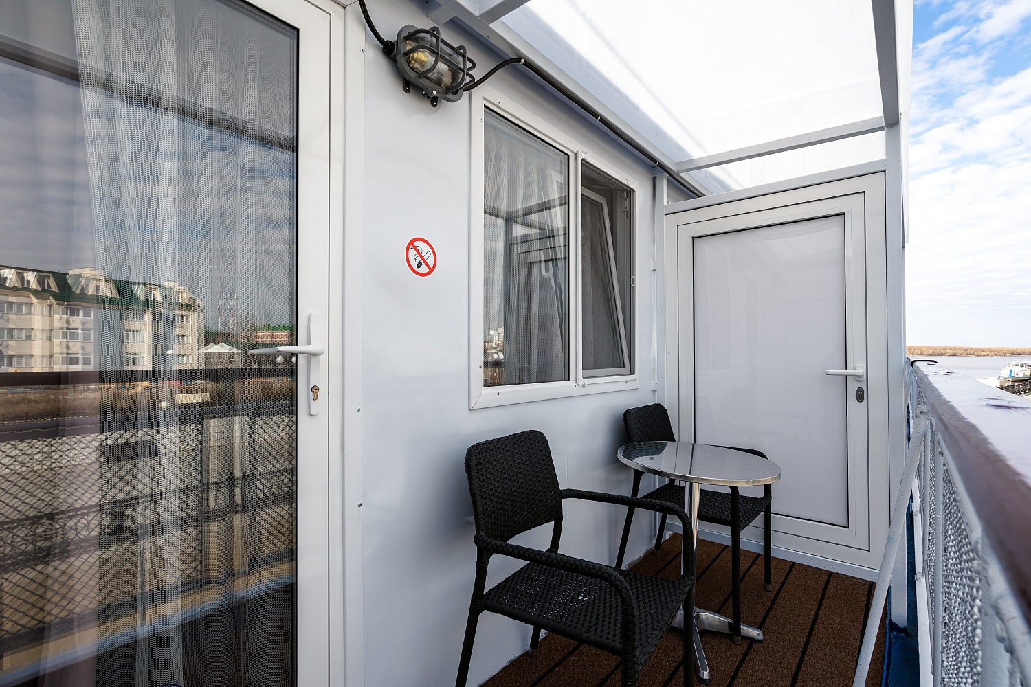 В каюте: одна двуспальная кровать (при необходимости трансформируется в две односпальные кровати), 2 прикроватные тумбы, стол письменный, пуф/стул, шкаф для одежды и посуды, вешалка для верхней одежды, зеркало, холодильник, ванная комната (раковина, душ, туалет), кондиционер, радио, сейф, фен, телевизор с кабельным и спутниковым вещанием, розетки 220 V, обзорное окно, балкон с мебелью для отдыха.